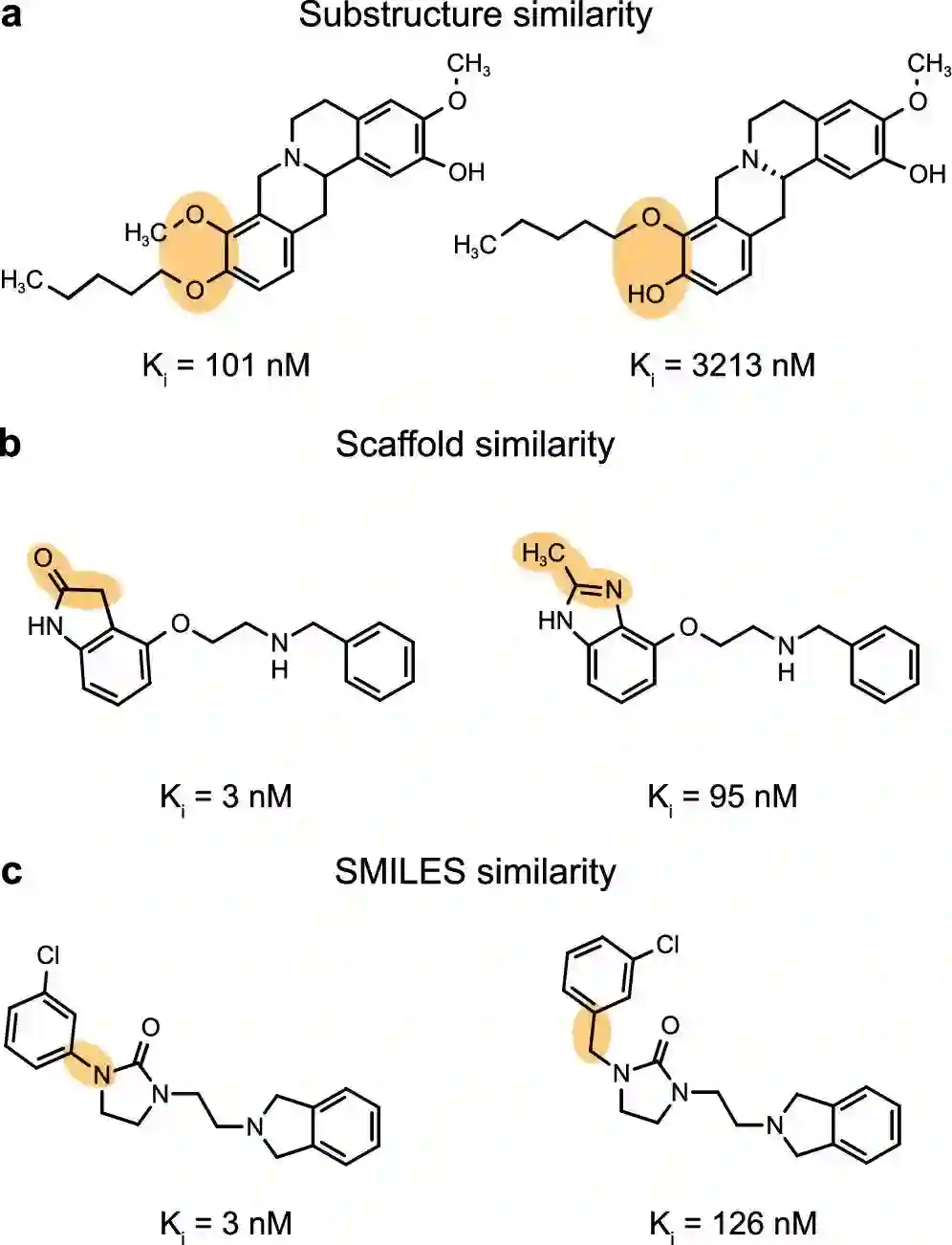 对于每个大分子靶标,通过考虑分子对的结构相似性和效力差异来确定活性悬崖。作者用三种不同的方法量化了属于同一数据集的任何分子对之间的分子相似性: A. Substructure similarity子结构相似性。在扩展连接性指纹(extended connectivity fingerprints, ECFP)上计算了Tanimoto系数,以捕捉一对分子之间共享的径向原子中心子结构的存在。该方法通过考虑分子包含的所有子结构集来捕捉分子之间的“全局”差异(图1a)。 B. Scaffold similarity 骨架相似性,通过计算原子骨架上的ECFP并计算相应的Tanimoto相似度系数来确定。骨架相似性允许识别分子核心有微小差异或基于其骨架装饰不同的成对化合物(图1b)。 C. Similarity of SMILES strings 通过Levenshtein距离捕捉SMILES字符串的相似性。该指标检测字符插入、删除和移位(图1c)。