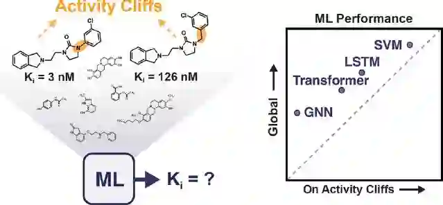 分子性质预测的核心原则之一是相似性原则,但是分子对之间存在活性悬崖的情况(即分子结构相似但是活性却相差巨大的情况)。 2022年12月1日,埃因霍芬理工大学的研究团队在Journal of Chemical Information and Modeling上发表论文Exposing the Limitations of Molecular Machine Learning with Activity Cliffs。