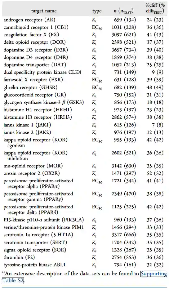 为了确保模型性能的全面分析,作者收集并整理了来自ChEMBL v29数据库中的30个大分子靶标的数据。最终得到的数据集包含总共48,707个分子(其中35,632个是唯一的)。数据集包括多个靶标家族,如激酶、核受体、G蛋白偶联受体、转移酶和蛋白酶等,数据集也有大有小,具体情况如表1所示。 表1 数据集概览Inhibition, 抑制常数;Agonism, 半最大效应浓度EC50。总分子数,测试集分子数,活性悬崖总比例%cliff,活性悬崖测试比例%clifftest。