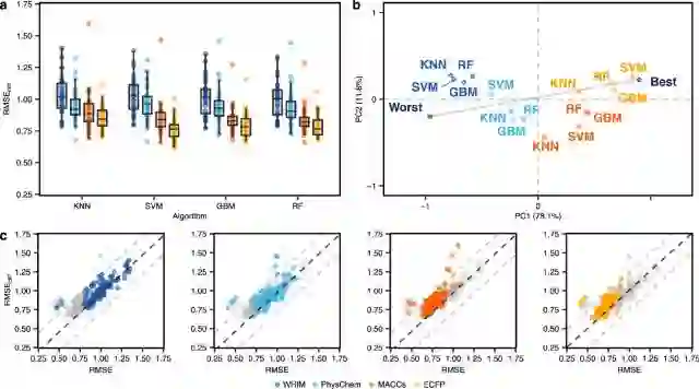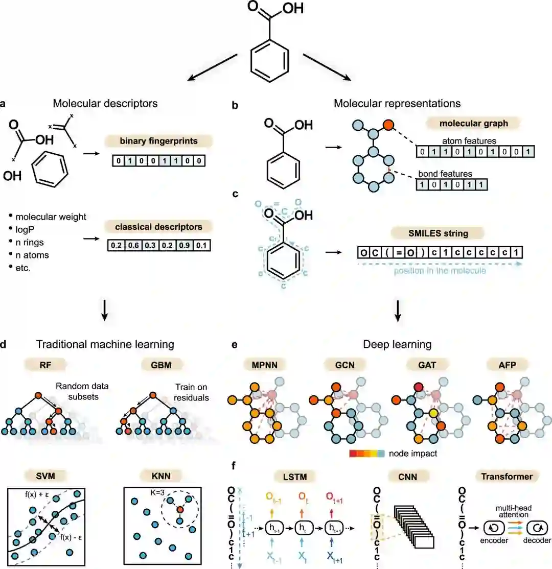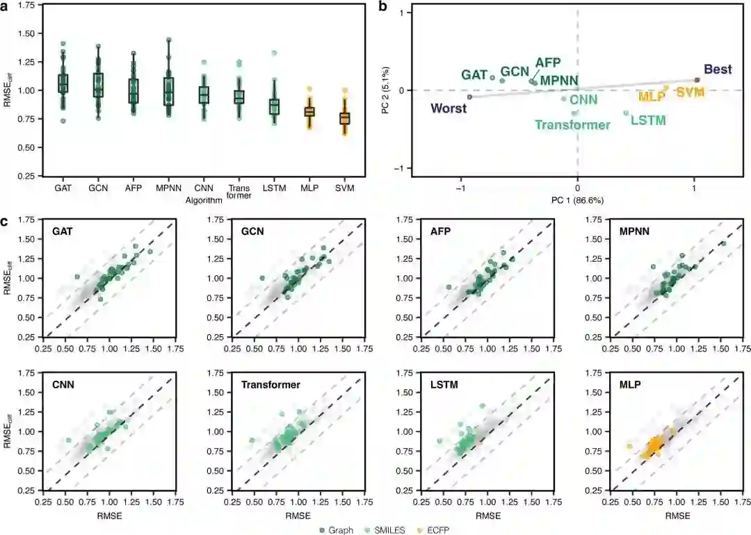 图2 机器学习方法汇总。(a) 分子描述符的简化表示,其捕获预定义的分子特征。本研究同时使用了二值分子指纹和传统的分子描述符。(b) 分子图,其中原子表示为节点(具有相应的节点特征),键表示为边(如果特征存在,则具有相应的边特征)。(c) SMILES字符串,具有二维信息(原子、键类型和分子拓扑结构)。(d) 选择了基于分子描述符训练的传统机器学习算法:随机森林(RF)、梯度增强机(GBM)、支持向量机回归(SVM)和K近邻(KNN)。(e) 深度学习方法。作者使用了四种可以从分子图中学习的图神经网络:消息传递神经网络(MPNN)、图卷积网络(GCN)、图注意力网络(GAT)和注意力分子指纹网络(attentive fingerprint, AFP)。节点颜色表示特征聚合期间其他节点对目标节点的影响(由虚线表示)。作者使用了三种可以从序列数据中学习的基于SMILES的方法:长短时记忆网络(LSTM)、一维卷积神经网络(CNN)和transformer模型。 2.5 模型结果