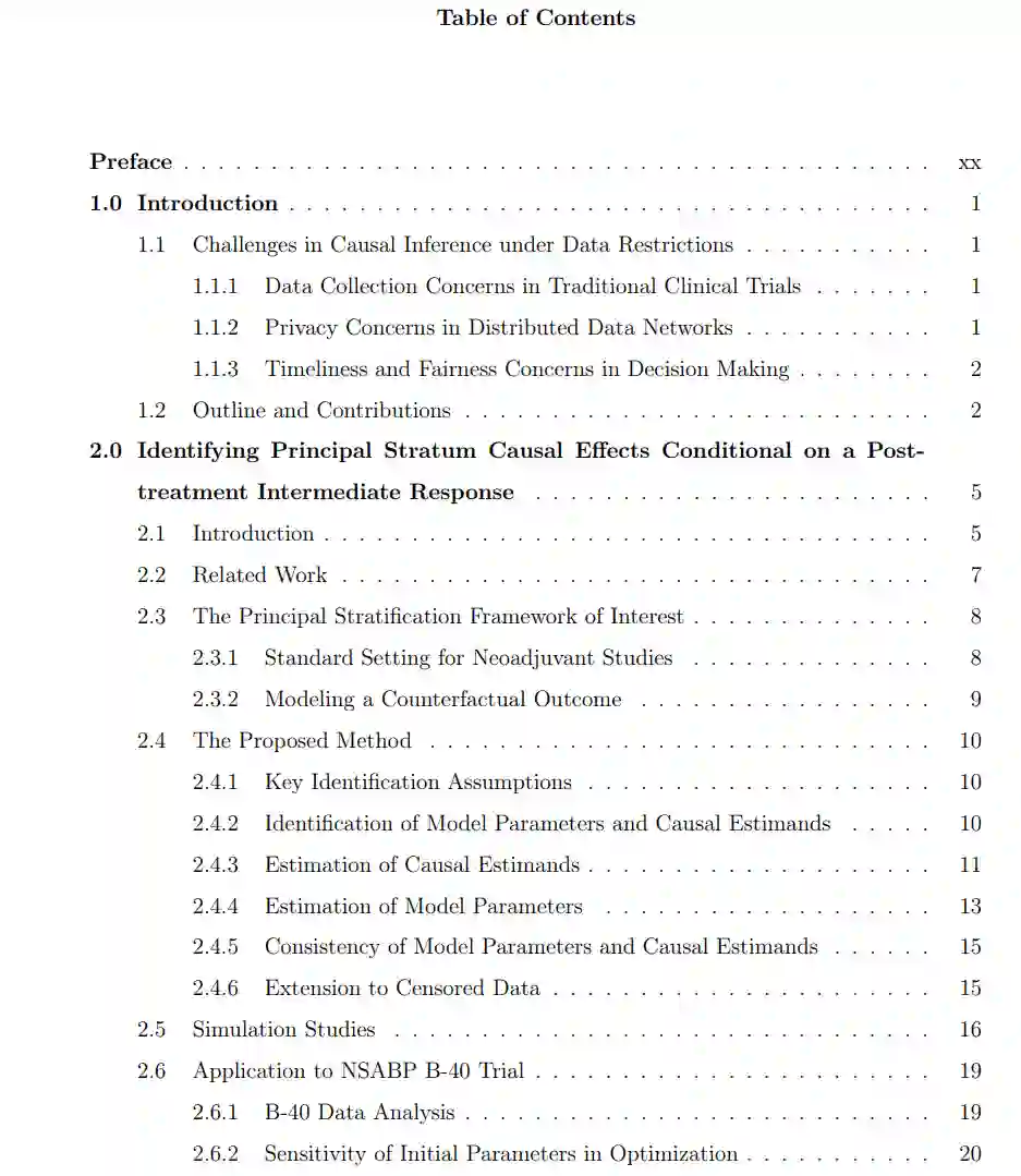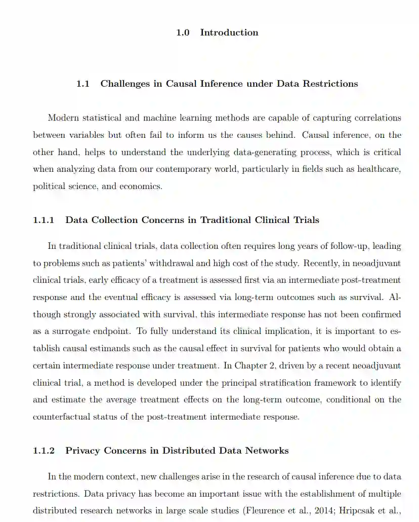 本文主要研究不确定性和数据限制下的现代因果推理,并将其应用于新辅助临床试验、分布式数据网络和鲁棒的个性化决策。在第一个项目中,我们在主要分层框架下提出了一种方法,以治疗后中间反应的反事实状态为条件,来识别和估计治疗对二元结果的平均影响。在温和的假设下,可以确定感兴趣的治疗效果。将该方法扩展到审查结果数据。将所提方法应用于新辅助临床试验,并通过仿真研究对其性能进行评估。在第二个项目中,我们提出了一种基于树的模型平均方法,通过利用来自其他潜在异构站点的模型,在不共享主题级数据的情况下,提高目标站点条件平均处理效果的估计精度。据我们所知,目前还没有建立分布式数据的模型平均方法,专注于改善治疗效果的估计。通过对氧疗对医院生存率的因果影响的研究,证明了这种方法的性能,并得到了综合模拟的支持。