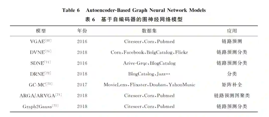在无监督学习任务中,自编码器(autoencoder, AE)及其变体扮演者非常重要的角色,它借助于神 经网络模型实现隐表示学习,具有强大的数据特征 提取能力.AE 通过编码器和解码器实现对输入数 据的有效表示学习,并且学习到的隐表示的维数可 以远远小于输入数据的维数,实现降维的目的.AE 是目前隐表示学习的首选深度学习技术,当我们把 具有某些联系的原始数据(X1,X2,…,Xn)输入到 AE中进行重构学习时,可以完成特征提取的任务. 自编码器的应用场景是非常广泛的,经常被用于数据去噪、图像重构以及异常检测等任务中.除此之 外,当 AE被用于生成与训练数据类似的数据时, 称之为生成式模型.由于 AE具有上述优点,一些学 者便将 AE 及其变体模型应用到图神经网络当中 来.文 献 [69]第 1 个 提 出 了 基 于 变 分 自 编 码 器 (variationalautoencoder,VAE)的变分图自编码器 模型 (variationalgraphautoencoder,VGAE),将 VAE应用到对图结构数据的处理上.VGAE利用隐 变量学习出无向图的可解释隐表示,使用了图卷积 网络编码器和一个简单的内积解码器来实现这个模 型.