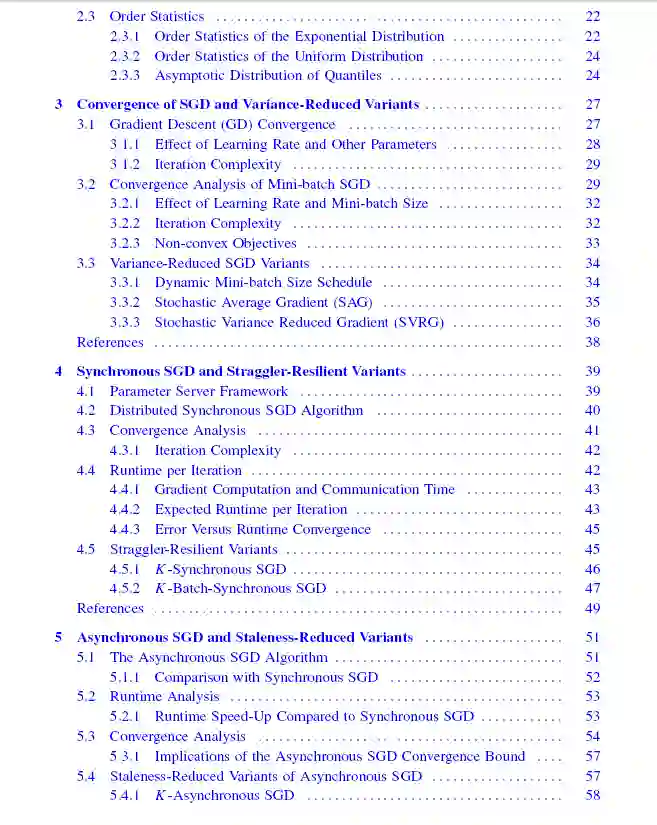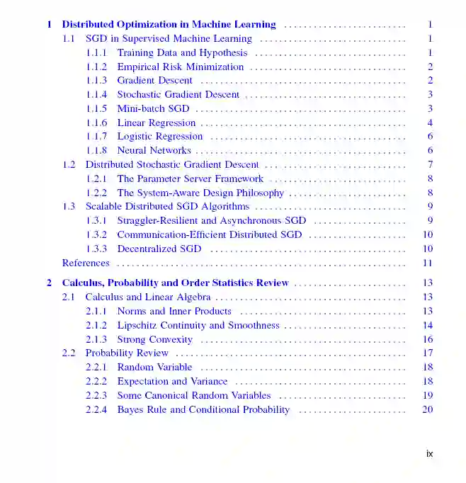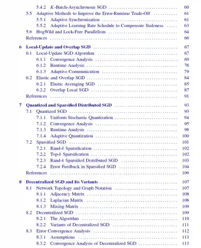 随机梯度下降是当今有监督机器学习训练的支柱。经典的SGD被设计为运行在单个计算节点上,其误差收敛与迭代次数的关系在优化和学习理论文献中得到了广泛的分析和改进。然而,由于今天使用了大量的训练数据集和模型,在单个节点上运行SGD可能会非常慢。这需要SGD的分布式实现,其中梯度计算和聚合被划分到多个工作节点上。虽然并行提高了每次迭代处理的数据量,但它使SGD暴露于由计算基础设施的变化引起的不可预测的节点速度减慢和通信延迟。因此,迫切需要使分布式SGD快速,并对系统变化具有鲁棒性。在本书中,我们将讨论大规模机器学习中最先进的算法,这些算法通过异步聚合、局部更新、量化和去中心化共识等技术来提高分布式SGD的可扩展性。这些方法以不同的方式减少通信成本:异步聚合允许通信和局部计算重叠,局部更新减少通信频率从而将通信延迟分摊到几个迭代中,量化和稀疏化方法减少了每次迭代的通信时间,去中心化共识通过允许网络拓扑中的不同节点训练模型并与邻居并行平均模型,从而减少了空间通信。
