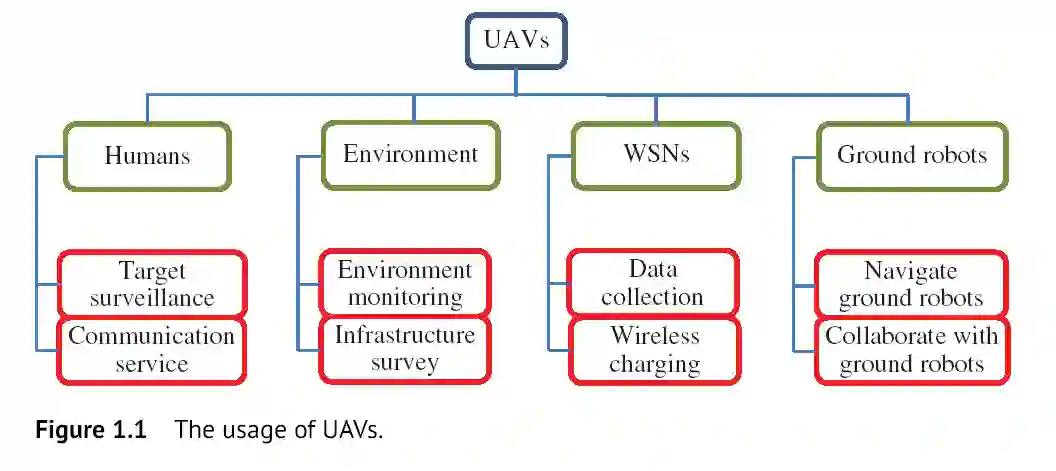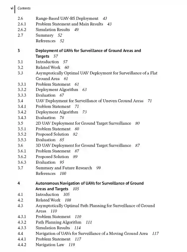 本书以问题为导向,而不是以技术为导向。因此,每一章都是独立的,并致力于详细讨论一个有趣的问题,出现在快速发展的无人机应用领域。我们从控制系统的角度提出了相关的方法。因此,在第2-6章中,我们首先介绍了系统模型,然后阐述了感兴趣的问题,随后提出了解决这些问题的方法。最后,通过计算机仿真验证了所提方法的有效性。本书的结构如下。在第二章中,我们讨论了无人机作为空中基站提供蜂窝服务的应用。研究了无人机的主动部署问题。在此类应用中,无人机的部署对服务质量起着关键作用。研究了两种典型的场景。第一种场景是在城市地区,无人机被部署在街道上以避免与建筑物碰撞。第二种情况是针对灾区的。我们提出了几个优化问题来优化无人机提供的服务质量,并提出了计算高效的算法来解决这些问题。第三章讨论了利用无人机监测地面区域和目标的一些最新进展。具体来说,我们提出了找到配备面向地面摄像机的无人机的最小数量及其部署位置的方法,以全面监控一个感兴趣的区域,该区域可以是平坦的区域,也可以是有建筑物、山丘或山脉的不均匀区域。我们还提出了一种算法,可以找到无人机的最优位置,以调查一定区域内的一组地面目标。我们开发了用于无人机2D和3D部署的部署算法。并对这些方法的性能进行了理论分析。在第四章中,我们讨论了无人机在地面区域和目标的监视和监测方面的应用,这些应用对应于各种实际应用,包括但不限于海上石油泄漏、洪水和煤灰泄漏等灾害过程的监视,以及对地面车辆和行人的监控。