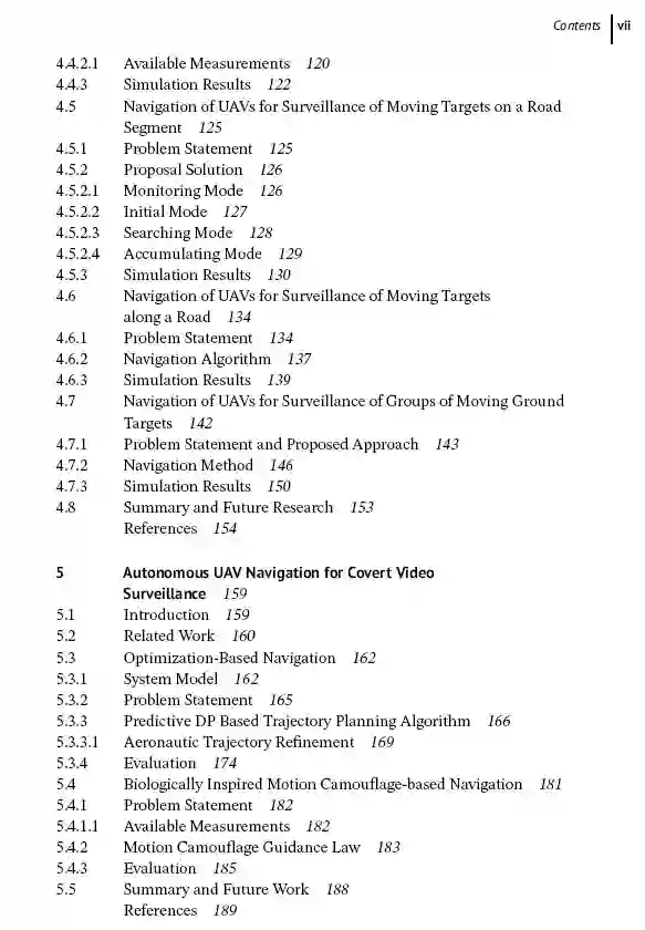 第五章重点研究了利用无人机进行隐蔽视频监控,这是一个比较新的研究领域。与第3章和第4章中讨论的通常监视应用不同,隐蔽监视要求无人机的意图不被感兴趣的目标发现。我们提出两种方法来解决这个问题。第一种方法是基于优化的。提出了一种新的指标来表征伪装性能,该指标评估了无人机与目标之间相对距离和角度的变化。然后,在无人机自身运动约束和目标保持在视线范围内的条件下,提出了无人机伪装性能最大化和能量效率最小化的优化问题。提出了一种动态规划的方法来在线规划无人机的飞行轨迹。第二种方法是一种基于生物的运动伪装方法。为实现情感伪装,无人机始终在目标与固定参考点之间的直线段上运动。提出了一种仅以轴承信息为输入的滑模控制策略。我们提出了大量的计算机模拟来演示这些方法的性能。