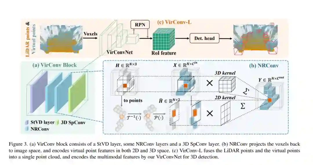 近年来,通过深度补全无缝融合RGB图像和LiDAR数据的基于虚拟/伪点的三维物体检测方法受到了广泛关注。然而,图像生成的虚拟点非常密集,在检测过程中引入了大量的冗余计算。同时,不准确的深度补全带来的噪声严重降低了检测精度。本文提出一种快速有效的骨干网络VirConvNet,基于一种新的算子VirConv (Virtual Sparse Convolution),用于基于虚拟点的3D目标检测。VirConv由两个关键设计组成:(1)随机体素丢弃(StVD)和(2)NRConv(抗噪子流形卷积)。StVD通过丢弃大量邻近的冗余体素来缓解计算问题。NRConv通过在2D图像和3D LiDAR空间中编码体素特征来解决噪声问题。通过集成VirConv,首先基于早期的融合设计开发了一个高效的流水线VirConv- l。然后,基于变换后的求精方案构建高精度流水线virconvt;最后,基于伪标签框架实现了半监督流水线VirConv-S。在KITTI car 3D检测测试排行榜上,我们的VirConv-L以56ms的快速运行速度实现了85%的AP。VirConv-T和VirConv-S分别获得了86.3%和87.2% AP的高精度,目前分别排在第2和第1位。代码可以在https://github.com/hailanyi/VirConv上找到。