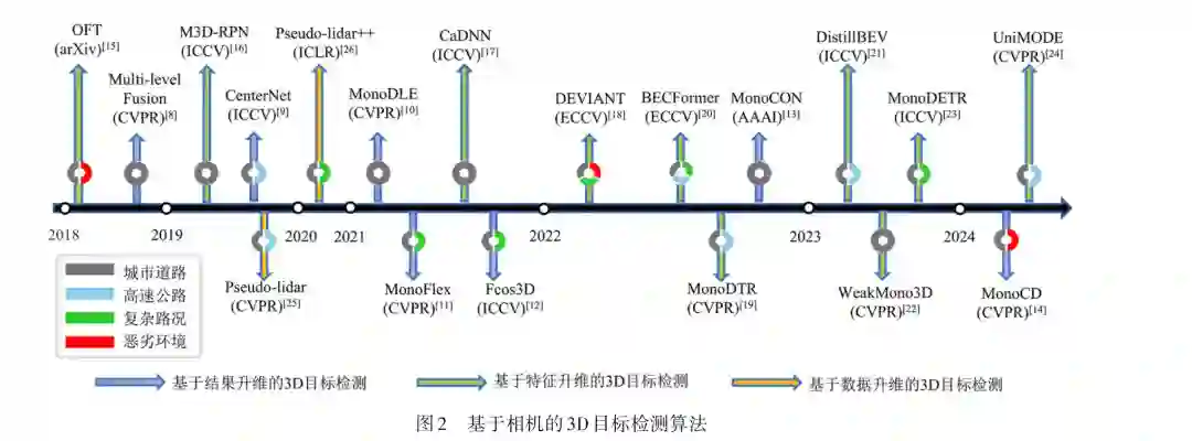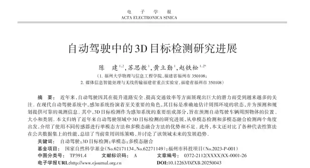 摘 要: 近年来,自动驾驶因其在提升道路安全、提高交通效率等方面展现出巨大的潜力而受到越来越多的关 注. 在现代自动驾驶系统中,感知系统扮演着至关重要的角色,其目标是准确地估计周围环境的状态,并为预测和规 划提供可靠的观测信息. 其中,3D目标检测作为感知系统的重要组成部分,旨在预测自动驾驶车辆周围物体的位置、 大小和类别. 本文归纳了近年来自动驾驶领域中3D目标检测的研究进展,从单模态检测和多模态融合检测两个角度 出发,介绍了使用不同传感器进行单模态方法和多模态融合方法的优势和不足. 此外,本文还对比了各种代表性算法 在公共数据集上的性能,总结了当前常用训练策略,并讨论了该领域未来的发展趋势. 关键词: 自动驾驶;3D目标检测;单模态;多模态融合