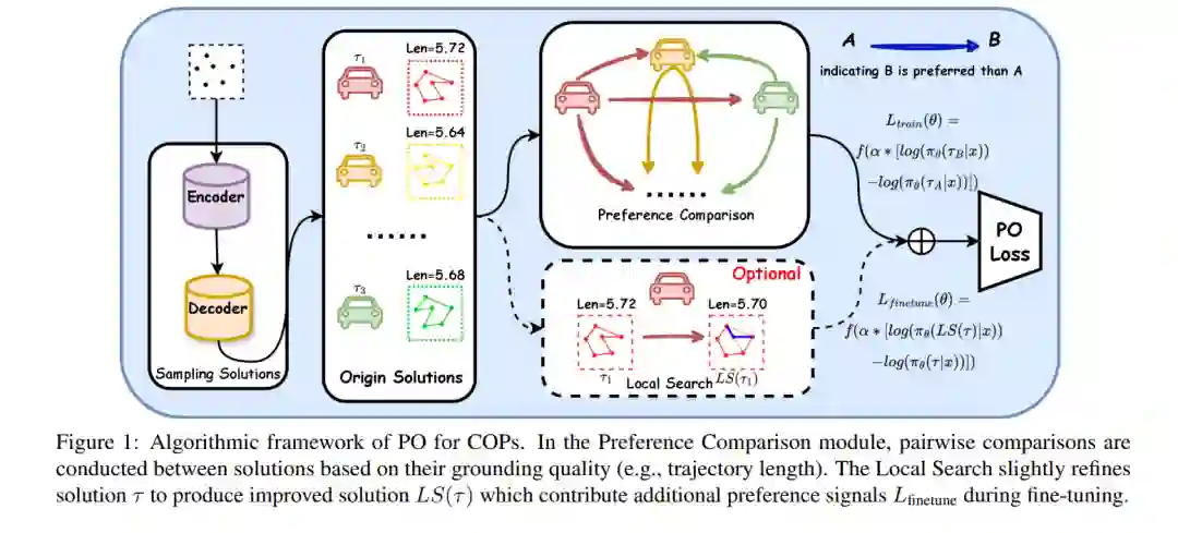 强化学习(Reinforcement Learning, RL)已成为神经组合优化领域的一项强大工具,使模型能够在无需专家知识的前提下学习启发式策略以求解复杂问题。尽管取得了显著进展,现有的强化学习方法仍面临诸多挑战,如奖励信号逐渐减弱、在庞大的组合动作空间中探索效率低下,最终导致整体性能受限。 为此,本文提出了一种新颖的方法——偏好优化(Preference Optimization),通过统计比较建模将传统的定量奖励信号转化为定性的偏好信号,强调在采样解之间的相对优劣。具体而言,我们通过将奖励函数重参数化为策略形式,并引入偏好建模,构建了一个熵正则化的强化学习目标函数,该目标可使策略直接对齐于偏好,同时规避了难以处理的计算过程。 此外,我们将局部搜索技术集成到策略微调过程中,而非作为后处理步骤,用于生成高质量的偏好对,从而帮助策略跳出局部最优解。 在多个经典基准任务上(如旅行商问题 TSP、有容量限制的车辆路径问题 CVRP,以及柔性流水车间调度问题 FFSP)进行的实证研究表明,所提出的方法在收敛效率和解质量方面均显著优于现有的强化学习算法。