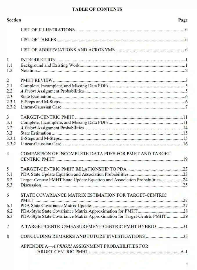 正如参考文献4中所讨论的,PMHT对每个目标进行多次测量会导致杂波以及来自干扰目标的测量在跟踪的每个目标附近的 "过度好客 "现象。这个问题的一个潜在解决方案是改变PMHT的分配模式,使每个目标最多接受一次测量。做到这一点的一个方法是,在PMHT分配模型中,就独立性和分配方向的假设而言,交换测量和目标的角色;也就是说,假设目标是独立于测量的,并在每次扫描时引入缺失的目标到测量的分配(而不是测量到目标的分配)。与PMHT不同的是,在PMHT中,一个扫描中的多个测量可能被分配给同一个目标,而在这个替代的PMHT中,多个目标可能被分配给一个扫描中的同一个测量。这一结果对于在测量域中或相对于传感器分辨率而言间隔较近的目标来说似乎是合理的。参考文献5探讨了在PMHT分配模型中交换测量和目标的角色的基本想法,尽管该参考文献中的许多细节要么被省略,要么不清楚,而且丢失的目标到测量分配的统计模型似乎并不完全合理。尽管如此,参考文献5是第一个关于在PMHT分配模型中调换测量和目标角色的公开文献参考。本报告彻底研究了这种角色互换的意义以及由此产生的新的PMHT算法。在下文中,这种新的算法将被称为以目标为中心的PMHT,以强调其目标到测量的分配模型;*原始的PMHT,如参考文献1和2中得出的,根据其测量到目标的分配模型,可以认为是以测量为中心的,将被交替称为以测量为中心的PMHT,原始的PMHT,或简单的PMHT。