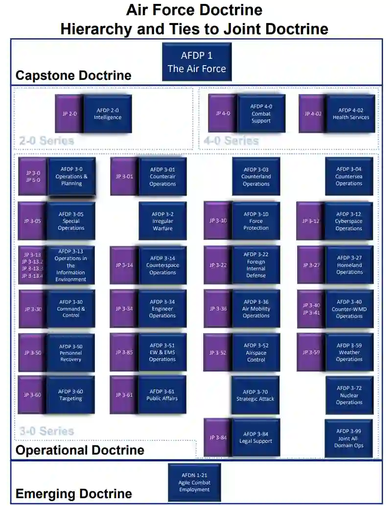 条令智慧书的第一部分提供了空军的顶点和作战条令结构。条令智慧书的第二部分包括每份经批准的空军条令出版物(AFDP)及其与联合出版物(JP)关系的概要。空军的顶点条令出版物,AFDP1《空军》,由空军参谋长签署。《作战条令》则由勒梅中心指挥官签署。