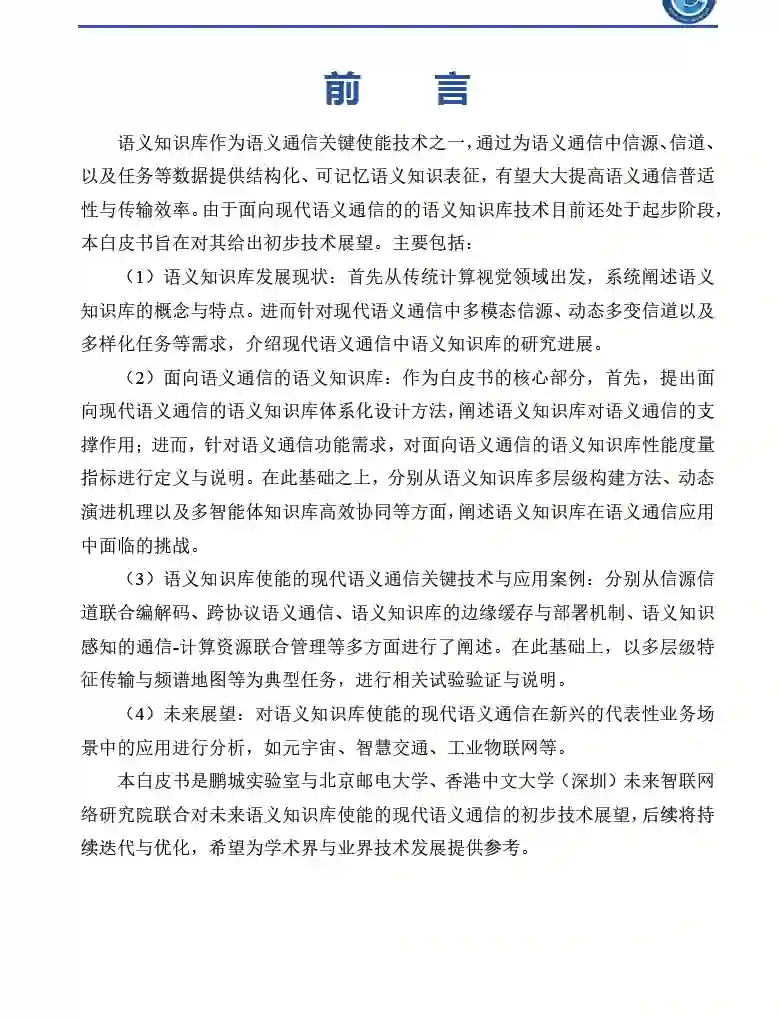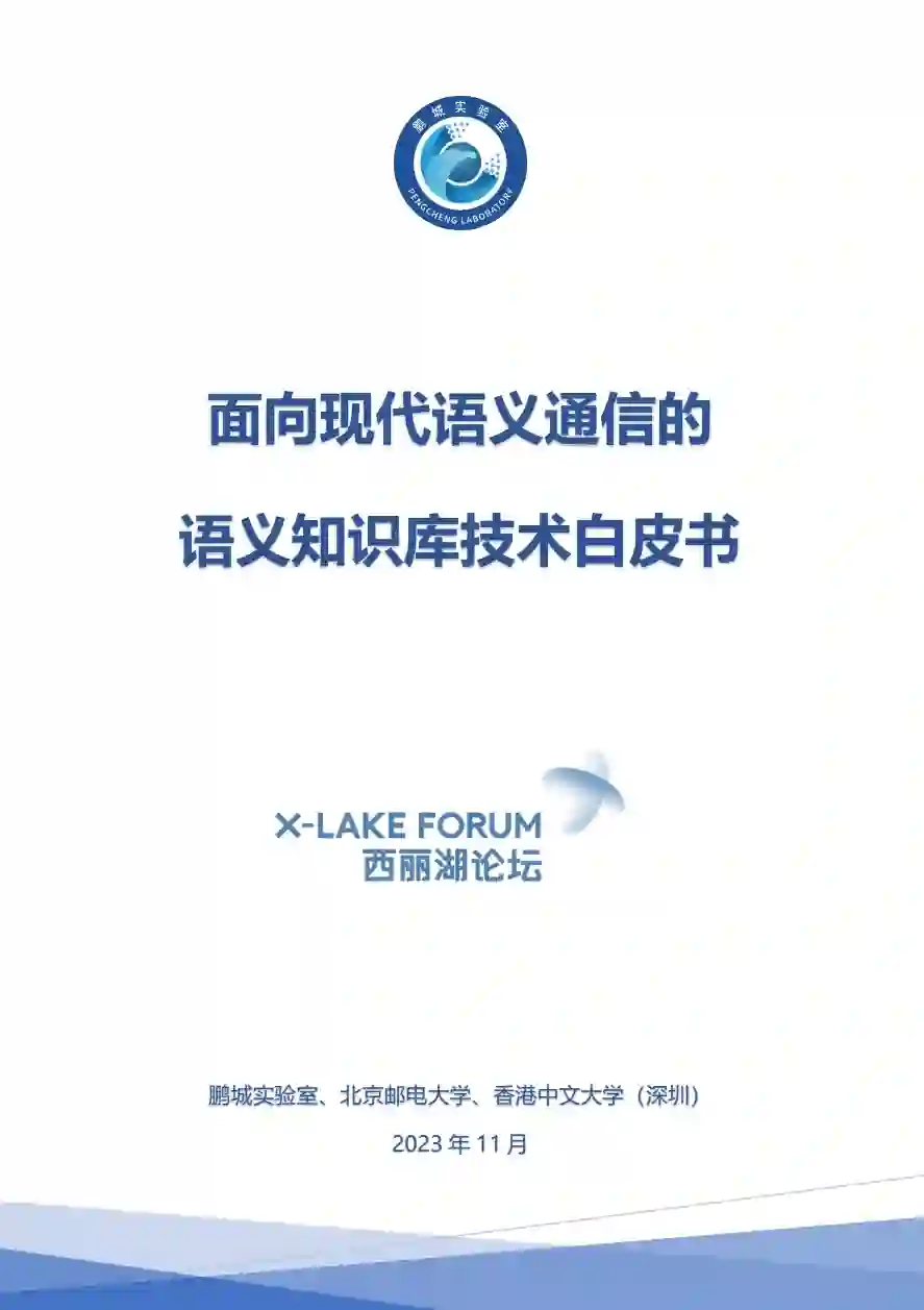 2023年11月17日,由鹏城实验室牵头撰写的《面向现代语义通信的语义知识库技术白皮书》在2023西丽湖论坛通信与网络技术发展论坛-通信与网络智能演进国际学术会议(IECN)上正式发布,这是全球首个面向语义通信的语义知识库技术白皮书,对于语义通信6G标准化具有重大意义。北京邮电大学、香港中文大学(深圳)等单位共同参与了该白皮书。