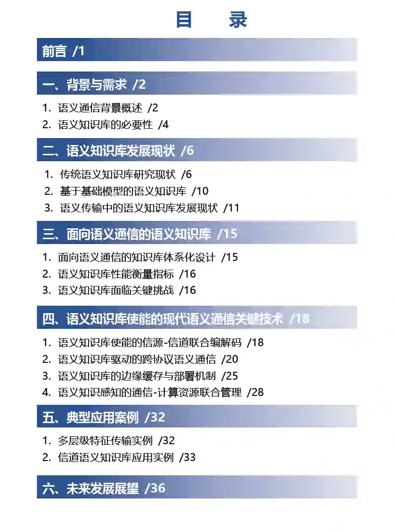 《面向现代语义通信的语义知识库技术白皮书》从语义通信和语义知识库背景与现状出发,提出了一种面向现代语义通信的语义知识库体系架构,重点分析了相应的关键技术,探讨了语义知识库使能的信源信道联合编码、多层级特征传输、跨协议语义通信技术等;介绍了语义知识库的缓存与部署机制以及语义知识感知的通信-计算资源联合管理方法;最后对语义通信的场景应用进行了展望,为学术界和产业界针对语义知识库使能的语义通信技术研究提供了参考和指引,并为推动语义通信的标准化进程打下坚实基础。接下来,鹏城实验室将在面向6G的语义通信技术研究领域不懈努力,持续探索新型通信网络新范式,推动关键技术发展与落地,为构建“智慧内生,原生简约”的新一代移动通信系统、加快6G标准化进程、助力通信产业高质量发展贡献力量。