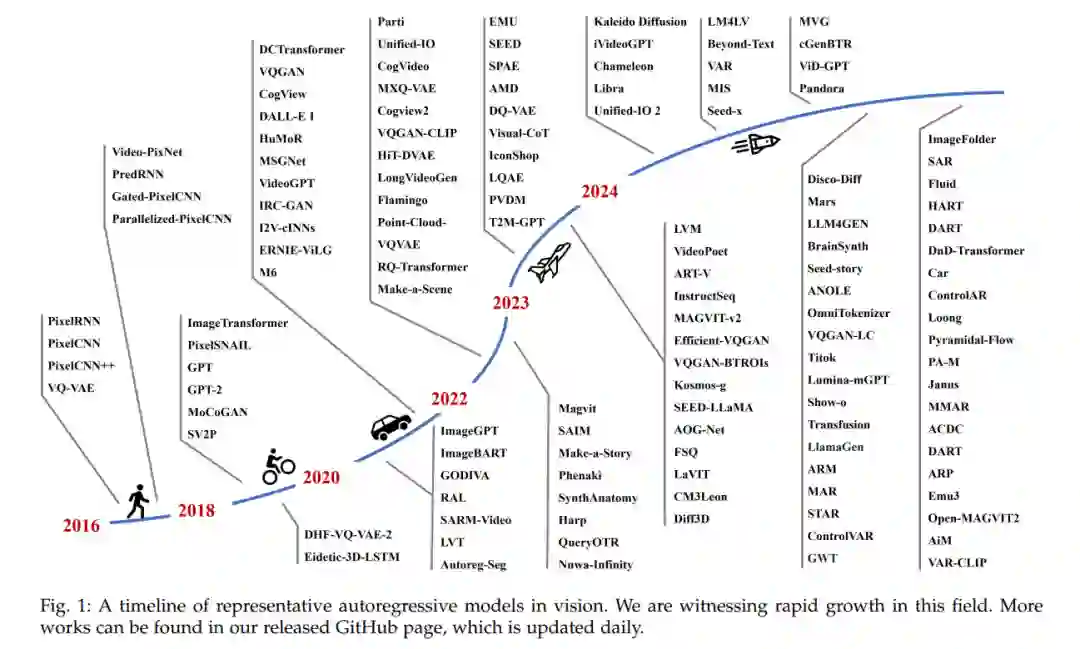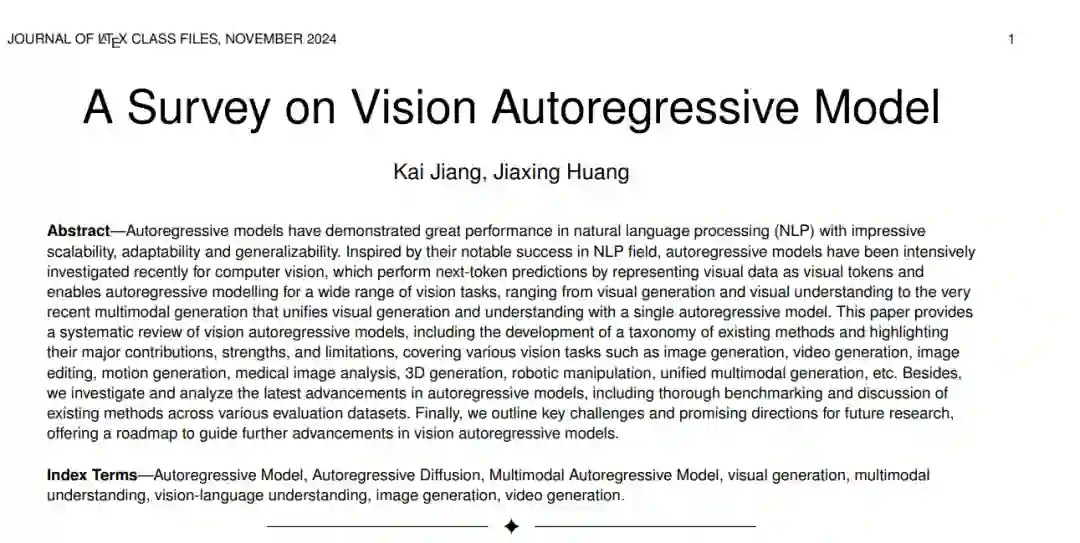 自回归模型(Autoregressive Models)在自然语言处理(NLP)领域中展现了卓越的性能,具有令人印象深刻的可扩展性、适应性和泛化能力。受其在NLP领域显著成功的启发,自回归模型近年来在计算机视觉领域得到了广泛研究。这些模型通过将视觉数据表示为视觉标记并执行下一个标记预测,为图像生成、视觉理解以及最近将视觉生成与理解统一为单一自回归模型的多模态生成等多种视觉任务提供了支持。 本文对视觉自回归模型进行了系统综述,包括对现有方法的发展分类,并突出了它们的主要贡献、优势与局限性,涵盖了图像生成、视频生成、图像编辑、动作生成、医学图像分析、三维生成、机器人操作、统一多模态生成等多种视觉任务。此外,我们调查并分析了自回归模型的最新进展,包括在各种评估数据集上的方法基准测试和深入讨论。最后,我们总结了关键挑战和未来研究的潜在方向,为视觉自回归模型的进一步发展提供了路线图。