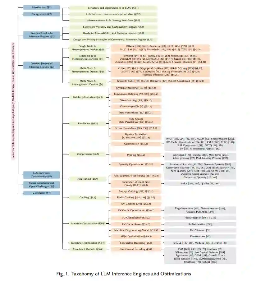 大型语言模型(LLMs)已广泛应用于聊天机器人、代码生成器和搜索引擎等领域。链式思维(chain-of-thought)、复杂推理、智能体服务(agent services)等工作负载往往需要多次调用模型,从而显著增加了推理成本。为降低成本,业界采用了并行化、模型压缩和缓存等优化方法,但由于服务需求多样,难以统一选用最合适的优化策略。近年来,专门面向LLM的推理引擎逐渐成为集成这些优化方法并支撑面向服务架构的关键组件。然而,目前仍缺乏对推理引擎的系统性研究。 本文对25个开源及商用推理引擎进行了全面评估。我们从易用性、部署便利性、通用性支持、可扩展性,以及面向吞吐量与延迟感知计算的适用性等多个维度对各推理引擎进行了深入分析。此外,我们通过调查各引擎所采用的优化技术,探讨其设计目标。对于开源引擎,我们评估了其生态系统的成熟度;对于商用方案,则分析了其性能表现及成本策略。 本文还指出了未来的研究方向,包括对复杂LLM服务的支持、对多样化硬件的兼容性,以及增强的安全性等,以期为研究人员和开发者在选择与设计优化的LLM推理引擎时提供实用指导。我们还提供了一个公共代码库,以持续追踪该快速演进领域的最新进展:https://github.com/sihyeong/Awesome-LLM-Inference-Engine。
