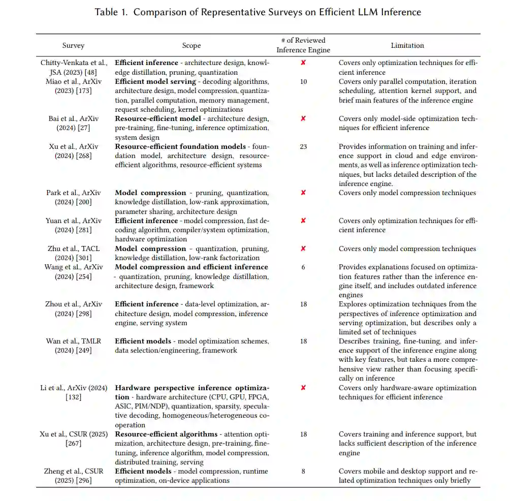 目前已有的一些关于 LLM 优化的综述(见表 1)多聚焦于具体技术,如模型压缩或硬件加速,因此未能全面探讨各个推理引擎所支持的优化方法。此外,这些研究也往往未涵盖近期发布的商用推理引擎。例如,Chitty-Venkata 等人 [48] 与 Yuan 等人 [281] 主要关注基于 Transformer 的模型压缩;而 Park 等人 [200] 和 Zhu 等人 [301] 则对压缩方法进行了深入研究。类似地,Xu 等人 [268, 267] 以及 Wang 等人 [254] 探讨了 LLM 推理与服务的优化策略。