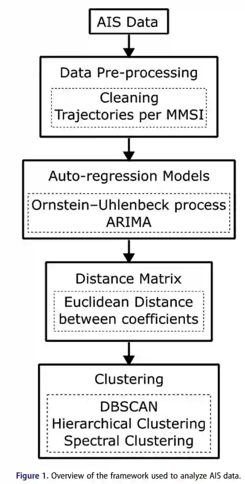 这项工作涉及对不同聚类方法的调查,使用开放源码数据来检测活跃的海洋地区的模式和异常船只行为(空间和时间)。选择使用开源数据使得这项工作可以重现,由于数据隐私规则,在发表的文献中并不总是如此。ARIMA和OU过程产生了描述轨迹动态的coecients,使用欧氏距离对其进行进一步聚类。本分析中使用的聚类技术包括基于密度的带噪声的空间聚类应用(DBSCAN)、分层聚类(HC)和谱聚类(SC)。该分析表明,使用自动回归技术与聚类算法的结合,有可能对船舶轨迹进行建模并检测行为模式。综上所述,这项工作的贡献包括: