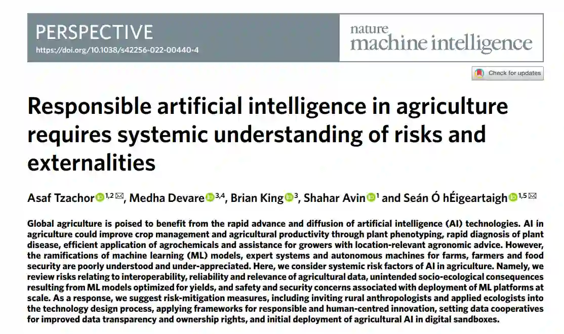作者认为,尽管人工智能在改善作物管理和农业生产力方面有着巨大的前景,但必须负责任地解决潜在风险,并在实验环境中对新技术进行适当测试,以确保它们是安全的,并能防止意外故障、意外后果和网络攻击。
