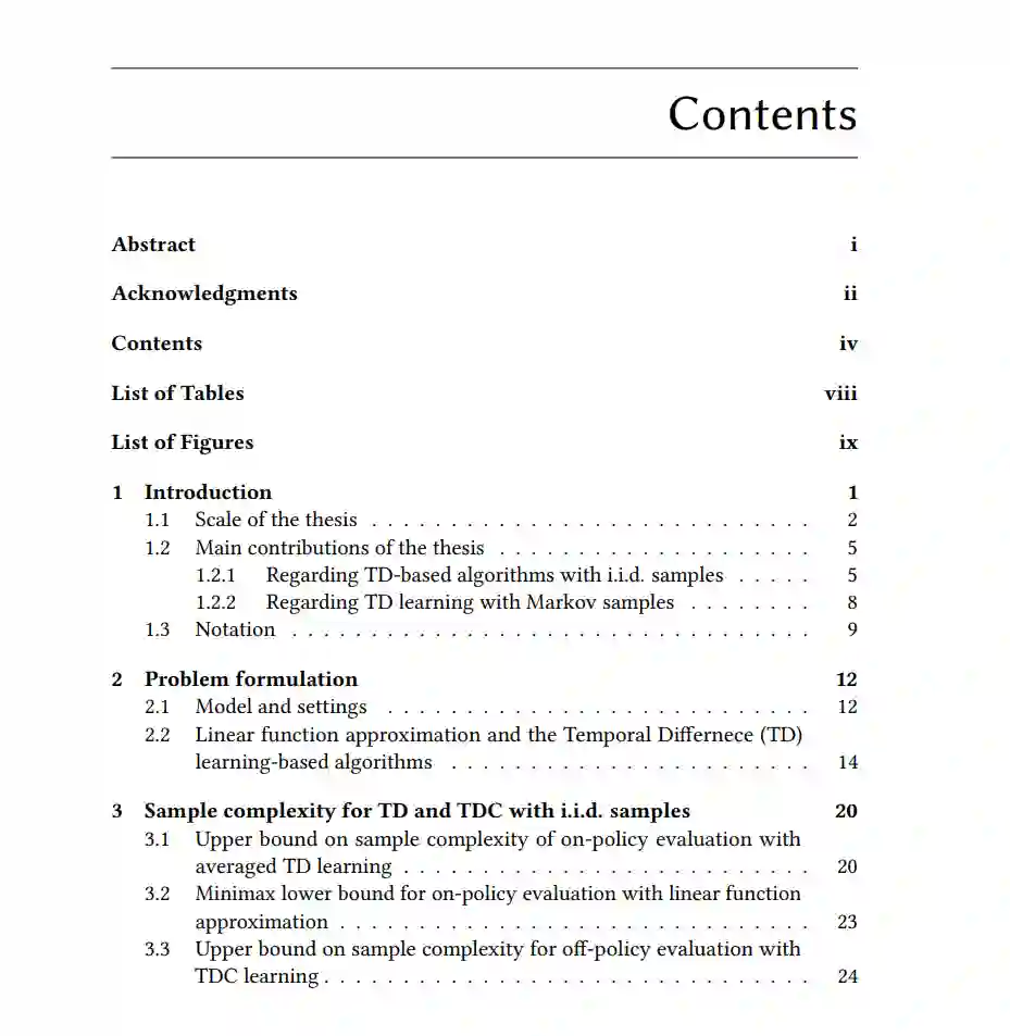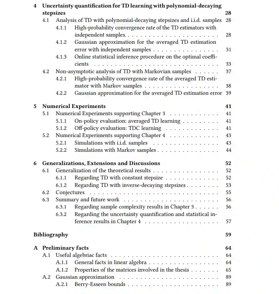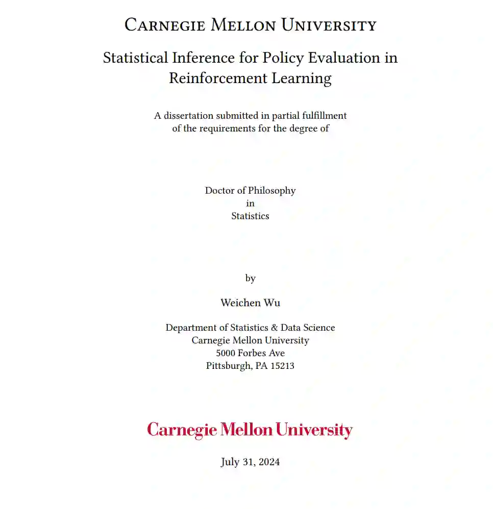 策略评估在强化学习(Reinforcement Learning,RL)的许多科学和工程应用中起着至关重要的作用,应用领域从临床试验到移动健康、机器人技术和自动驾驶等广泛覆盖。在众多用于策略评估的RL算法中,时序差分(Temporal Difference,TD)学习及其变体无疑是最为流行的。尽管通过TD学习进行策略评估的使用非常广泛且具有实际意义,但目前实践者缺乏支持其决策所需的统计工具。本文旨在解决这一问题,开发针对使用TD学习估计器进行策略评估的统计推断理论和方法。 论文的第一部分,我们推导出了基于线性函数近似的TD学习过程的估计误差的全新且精确的非渐近界。在假设独立样本的前提下,我们为平均TD学习和带梯度修正的两时间尺度TD学习提出了精确的样本复杂度界。在on-policy的设置下,我们的平均TD学习结果比之前的最先进界显著提升,其改进可以随着状态空间维度线性扩展。在off-policy的场景中,我们的上界首次在与容差水平相关的最小最大缩放下达到最优,同时表现出对所有问题相关参数的显式依赖。 论文的第二部分,我们聚焦于on-policy设置,开发了针对基于TD学习估计器的有效统计推断方法。我们利用在不同步长选择下TD估计器的有限样本分布逼近,并处理独立同分布样本和马尔可夫样本。我们取得了最先进的Berry-Esseen界,控制了TD估计误差收敛至其相应渐近分布的速率,并基于这些结果提出了一种在线算法来构建置信区间。我们验证了该置信区间在独立样本和马尔可夫轨迹下的有效性。