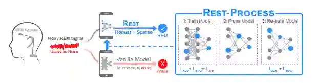 我们开发了REST,这是第一个专为家庭睡眠监测设计的噪声稳健和高效的深度学习模型,通过(1)对抗性训练和(2)频谱正则化赋予模型噪声稳健性;通过(3)稀疏正则化实现压缩,促进能源和计算效率(第八章)。