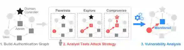 图1.3:D 2M框架:1. 从设备认证历史中建立一个认证图;2.允许安全分析师测试不同的攻击策略,研究网络漏洞;3.识别有风险的机器进行监控,预先阻止横向攻击。