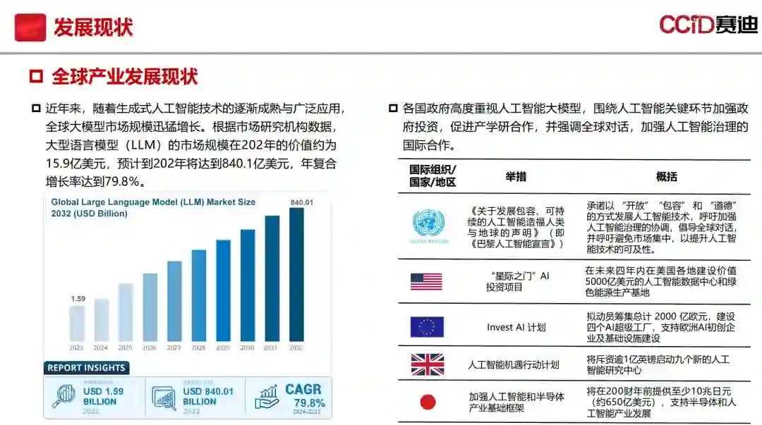近年来,随着生成式人工智能技术的逐渐成熟与广泛应用,全球大模型市场规模迅猛增长。根据市场研究机构数据,大型语言模型(LLM)的市场规模在202年的价值约为15.9亿美元,预计到202年将达到840.1亿美元,年复合增长率达到79.8%。 各国政府高度重视人工智能大模型,围绕人工智能关键环节加强政府投资,促进产学研合作,并强调全球对话,加强人工智能治理的国际合作。 发展现状 我国产业发展现状 近年来,我国人工智能产业呈现出蓬勃发展的态势,根据市场研究机构数据,2024年中国Al大模型市场规模达到165亿元,预计到2028年市场规模将达到624亿元,复合增长率为40%。 我国对于大模型行业整体秉持包容审慎的态度,大模型相关政策的颁布自2024年起呈现密集态势。 中央及各部委Al政策重在顶层设计和推广典型应用,地方AI政策主要强调Al技术的落地应用,引导地方传统产业实现转型升级等。