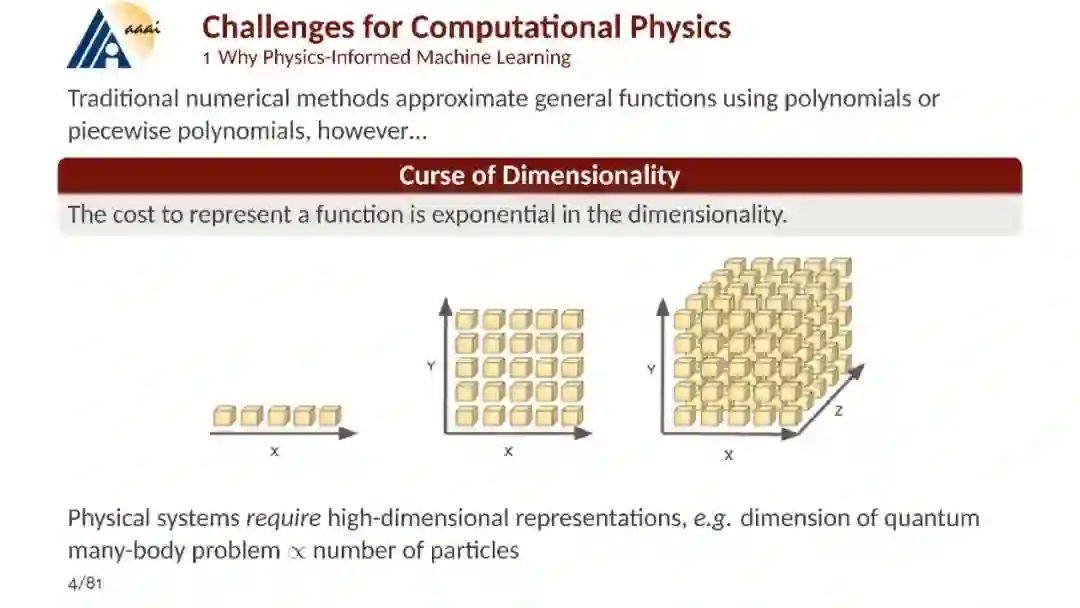机器学习(ML)正在引领计算科学的一场变革,为复杂的高维函数和泛函构建灵活、通用且高效的近似方法提供了一种新途径。这些新工具的影响开始被理解的一个领域是物理科学,在这个领域中,传统上难以处理的高维偏微分方程现在已经变得可解。本教程将探讨机器学习的发展如何补充物理科学中的计算问题,特别关注解决偏微分方程的问题,其中高维性和数据获取的挑战也随之出现。