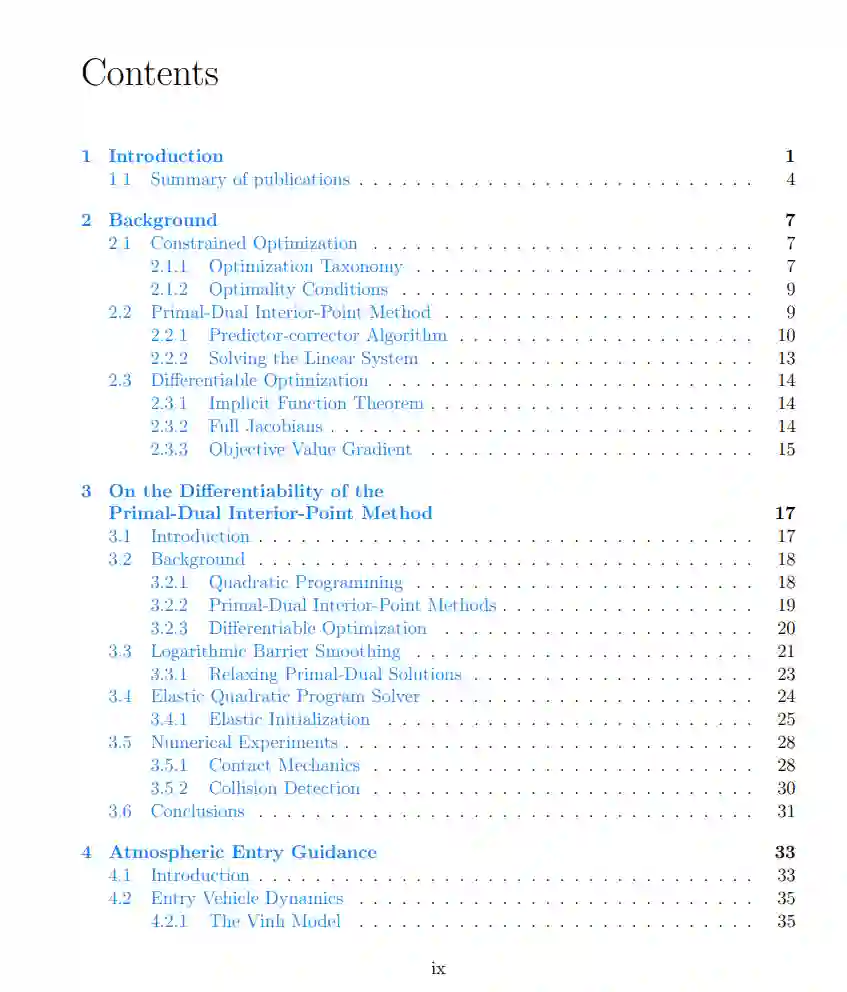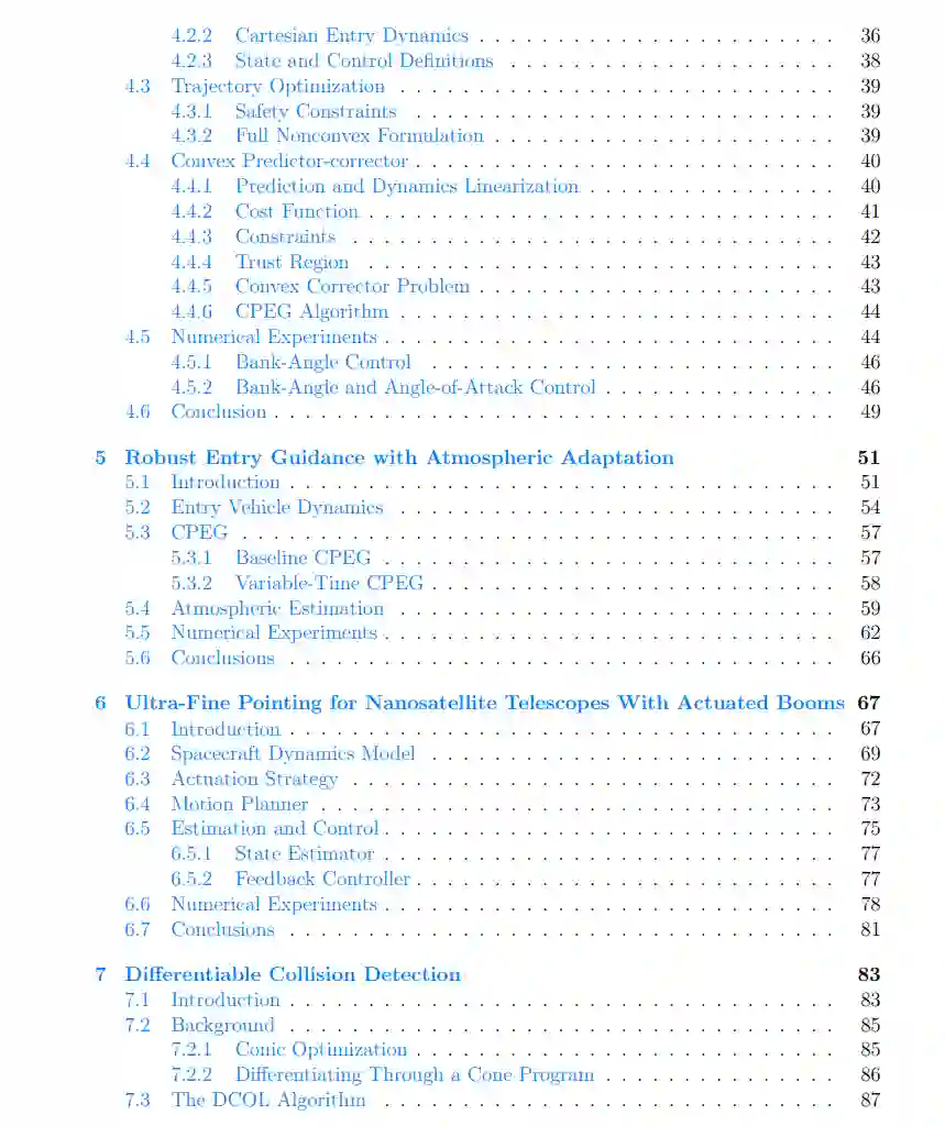 在1939年至1948年期间,Leonid Kantorovic、George Dantzig和John Von Neumann提出了线性规划和对偶性相关的约束优化基本概念[39]。大约在同一时期,Karush-Kuhn-Tucker(KKT)条件被确立,明确了解决约束优化问题时“最优解”的含义[24]。当时,实践者集中于在新引入的计算机上实现数值优化算法,而理论家则将注意力转向约束优化领域的有用分类法。1983年,苏联科学家Nemirovski和Yudin首次正式提出,解决凸优化问题与解决一般非线性优化问题之间存在实质性的复杂度差异[22]。1980年代,稳健的内点方法开始出现,能够在多项式时间内解决一般的凸优化问题[116]。随着数值线性代数、算法发展和更快计算机的进步,到2000年代,凸优化已经成熟并准备好在日常应用中使用。诸如CVX [63]、CVXPY [40]和Convex.jl [179]等建模工具使得凸优化变得易于使用,它们通过将用自然数学语法描述的问题转化为商业和开源求解器可以解决的形式,使凸优化变得更加易于应用。 在2010年代后期,[7]和[5]的研究使得能够对针对通用问题参数的凸优化问题进行求导。如今,凸优化求解器被视为经过充分理解和可靠的可微函数,可广泛应用于各类任务中。 第四章对一个经典的大气进入引导框架(可追溯到阿波罗计划)进行了更新,结合了凸优化,达到了最先进的性能。在4.2中,以一种在文献中不常见但更适合数值优化的形式,讨论了进入飞行器在任意大气中的动力学。在此基础上,详细描述了基于凸优化的创新型“凸预测-修正进入引导”(CPEG)算法,该算法在4.4节中用于大气引导。CPEG的性能在一组现实的初始条件下进行了验证,并在4.5节中验证了收敛性。 第五章在第四章的基础上进行扩展,介绍了CPEG的更新变种,能够在进入过程中直接考虑大气不确定性。CPEG中的引导框架通过引入一个能够进行大气估计的估算器来增强,并对控制器-估算器堆栈进行了调整,以实现对飞行器的鲁棒实时控制。该算法在现实的火星大气条件下进行测试,消融研究验证了大气适应的重要性。