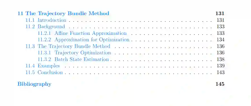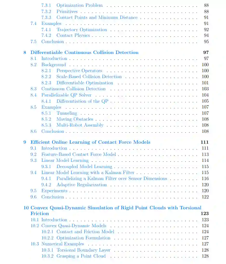 第六章利用基于凸优化的运动规划器,通过加权支杆的驱动实现纳米卫星空间望远镜的精确控制。传统上,航天器指向控制是通过反作用轮来完成的,这些转子通过旋转来转移角动量。由于这些轮子存在缺陷,振动会传递到望远镜,导致图像质量下降。本章介绍了一种基于慢速旋转长支杆的新型驱动策略,这一策略显著不同于常见的快速旋转反作用轮。在已知纳米卫星轨道和地球磁场的情况下,凸优化运动规划器能够直接推理未来的扰动,从而仅通过支杆实现精确的姿态控制。该技术在一个精确的空间望远镜上得到演示,在日全食期间需要进行长时间曝光,而支杆不会超过其驱动极限。 第七章提出了一种新的碰撞检测方法,能够提供统一框架和光滑的可微性。传统上,两个凸形状之间的碰撞检测是通过求解两形状之间的最近点来完成的。这个问题对于许多常见的凸体是定义明确且容易解决的,但对于接触的形状,这个方法是不可微的,因此需要采用不同的算法。我们的方法利用了一个不同的框架:通过凸优化求解两形状之间的最小均匀缩放,从而导致它们的交集。这个问题很小,确保定义良好且没有退化情况。结果凸优化问题的解是平滑且可微的,无论物体的配置如何,且该方法可用于指定代表性运动规划中的碰撞避免约束。 第八章通过利用第七章相同的框架扩展了连续碰撞检测。离散碰撞检测检查两个静态凸形状是否发生碰撞,而连续碰撞检测必须考虑形状在运动时的问题。传统上,离散碰撞检测向连续碰撞检测的过渡需要对算法进行大幅修改,并增加一些限制条件。相反,第七章的框架通过引入时间参数进行了扩展,利用另一个定义良好的凸优化问题来解决连续碰撞信息问题。该方法同样是完全可微的,并且在碰撞-free运动规划示例中得到了验证,证明了离散碰撞检测不足以避免接触。 第九章详细介绍了一种在线学习广义线性模型的简单而高效的框架,涉及到连接器插入问题。在这个应用中,插入公连接器到母插座中由于材料的变形、配合的紧密性以及未知的摩擦性质而成为一个难以模拟的挑战。为了避免学习一个完整的动态仿真器,本研究仅学习控制信号、估计状态和腕部安装的力矩传感器之间的关系。这个关系通过广义线性模型表示,从而使得模型学习问题变得凸且定义明确。为了解决这个问题,提出了线性模型学习(LML)算法,通过仅使用矩阵-向量操作来递归地在线学习全局最优的估计模型。在没有任何矩阵求逆的情况下,该算法在GPU上非常有效,能够快速高效地学习大规模线性模型。 第十章探讨了刚性点云上准动态仿真的性能,并扩展了常见的公式,以包括真实接触的必要扭矩摩擦。当与刚性点云发生接触时,单点接触无法提供真实的扭矩摩擦,这种摩擦源自于现实中存在的接触面补丁。为了解决这一问题,对基于优化的仿真框架进行了修改,自然地引入了与法向力成比例的扭矩摩擦项。结果的仿真步骤通过凸优化计算,因此完全可微。所得到的仿真器用于抓取具有真实接触动力学的高保真点云。 第十一章介绍了一种轨迹束方法,用于使用黑箱仿真器、成本和约束条件进行高精度轨迹优化。现有的基于模型的轨迹优化方法能够访问问题中所有成本、动力学和约束函数的导数。在许多情况下,这是一个合理的假设,但对于许多具有挑战性的机器人任务(如涉及非光滑接触交互的任务),这些导数可能无法获得、计算昂贵或不可靠。为了解决这个问题,轨迹束方法通过对当前迭代点进行插值来近似这些函数。这种插值的近似方法无需导数,并且其线性化不同于标准的一阶泰勒级数。使用这种近似方法,提出了一个凸优化问题,最小化这些插值函数以计算步进方向,直到收敛。 通过将可微凸优化作为一种稳健的技术,本论文为机器人多个领域提供了简单且高效的算法,并保证了可预测和安全的性能。通过将这些问题重构为优化优先的方式,得到的算法通常比传统方法更简单、更高效,同时具有模块化和可配置性。