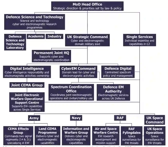 • 中、俄、美被公认为电磁战领域领导者。英国(及更广泛欧洲地区)存在显著能力短板,需依赖北约等国际合作伙伴。• 英国《2025年战略防务评估》将网络空间与电磁频谱确立为独立作战域(CyberEM),并宣布计划于2025年底前组建“网络电磁司令部”。