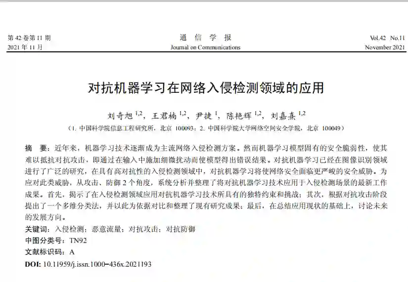 近年来,机器学习技术逐渐成为主流网络入侵检测方案。然而机器学习模型固有的安全脆弱性,使其难以抵抗对抗攻击,即通过在输入中施加细微扰动而使模型得出错误结果。对抗机器学习已经在图像识别领域进行了广泛的研究,在具有高对抗性的入侵检测领域中,对抗机器学习将使网络安全面临更严峻的安全威胁。为应对此类威胁,从攻击、防御2个角度,系统分析并整理了将对抗机器学习技术应用于入侵检测场景的最新工作成果。首先,揭示了在入侵检测领域应用对抗机器学习技术所具有的独特约束和挑战;其次,根据对抗攻击阶段提出了一个多维分类法,并以此为依据对比和整理了现有研究成果;最后,在总结应用现状的基础上,讨论未来的发展方向。