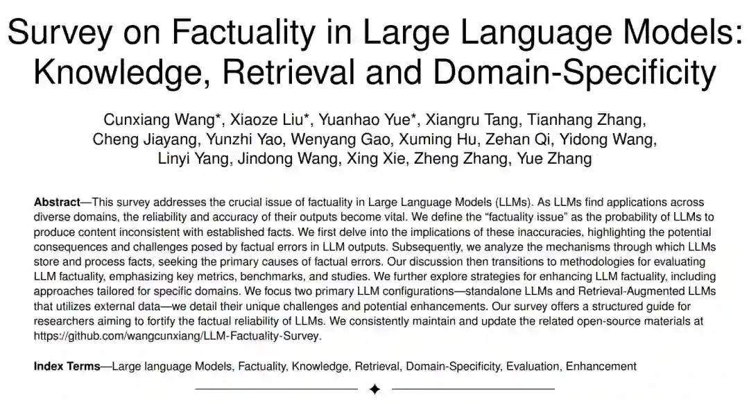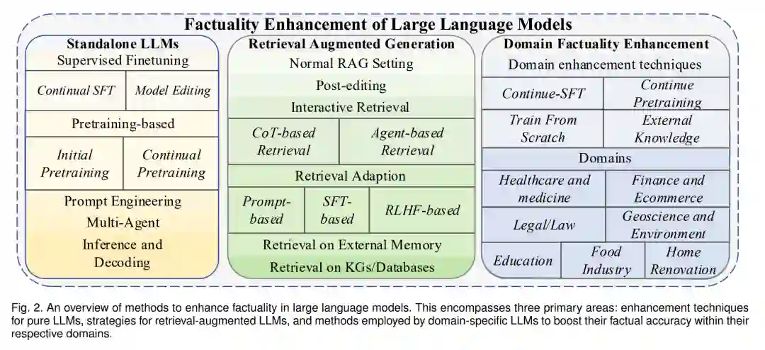 在这份综述中,我们系统地探讨了大型语言模型(LLMs)内部事实性问题的复杂景观。我们首先定义了事实性的概念(第2.2节),然后讨论了其更广泛的意义(第2.3节)。我们的旅程带领我们穿越了事实性评估的多面领域,包括基准(第3.2节)、指标(第3.1节)、特定评估研究(第3.3节)和特定领域的评估(第3.4节)。接着,我们深入探索,探讨了支撑LLMs中事实性的内在机制(第4节)。我们的探索在增强技术的讨论中达到高潮,既有纯LLMs(第5.1节)也有检索增强型LLMs(第5.2节),特别关注特定领域的LLM增强(第5.3节)。 尽管本综述中详细描述了许多进展,但仍有许多挑战。事实性的评估仍然是一个复杂的难题,由自然语言的固有变异性和细微差别使其变得复杂。关于LLMs如何存储、更新和产生事实的核心过程尚未完全揭示。尽管某些技术,如持续培训和检索,显示出了前景,但它们也不是没有局限性。展望未来,寻求完全基于事实的LLMs既带来挑战,也带来机会。未来的研究可能会深入了解LLMs的神经结构,开发更为强大的评估指标,并在增强技术上进行创新。随着LLMs日益融入我们的数字生态系统,确保其事实可靠性将始终是最重要的,这对AI社区及其更广泛的领域都有影响。