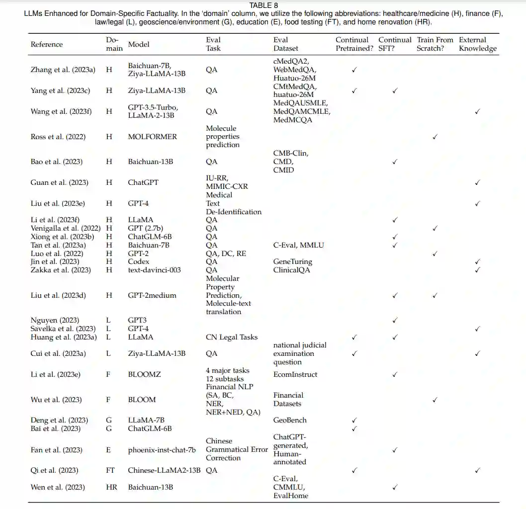领域知识缺陷不仅是限制LLM在特定领域应用的重要原因,而且是学术界和工业界都非常关心的一个主题。在这个小节中,我们讨论了那些特定领域的LLMs是如何增强它们的领域事实性的。 表8列出了领域事实性增强的LLMs。在此,我们包括了几个领域,包括医疗健康(H)、金融(F)、法律/法规(L)、地球科学/环境(G)、教育(E)、食品检测(FT)和家居翻新(HR)。