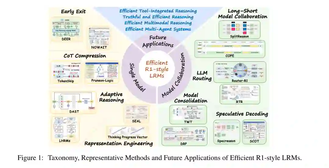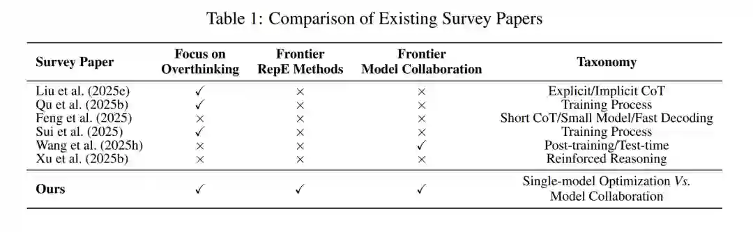 近年来,大型语言模型(Large Language Models,LLMs)在自然语言处理任务中取得了突破性进展。然而,在处理数学推理、多跳问答、程序验证等复杂任务时,LLMs 的推理能力仍然存在不足。因此,大型推理模型(Large Reasoning Models,LRMs)逐渐受到关注(Xu 等,2025b;Li 等,2025e;Chen 等,2025c)。这些模型通过引入**长链式思维(Long Chain-of-Thought,Long CoT)和自我反思(self-reflection)等方法,增强了结构化推理与高级认知能力,使其能够更有效地应对复杂问题。具有代表性的工作包括 OpenAI o1(Jaech 等,2024)、DeepSeek R1(Guo 等,2025)、Kimi 1.5(Team 等,2025)和 QwQ(Team,2024)。其中,DeepSeek R1 凭借其出色的推理精度与开源特性,成为 R1 风格 LRM 的标杆,其推理路径通常以 <think> 和 </think> 标签进行标注。 随着 R1 风格 LRM 在实际应用中的广泛部署,“过度思考”(overthinking)问题逐渐显现(Chen 等,2024b;Team 等,2025)。具体而言,在生成答案时,模型往往构建冗长的 CoT,包含冗余或低效的中间推理步骤。这不仅显著降低了推理效率、增加了计算成本,额外的推理过程还可能引入不确定性和输出的波动性,从而影响最终结果的准确性(Suvra Ghosal 等,2025)。例如,对于一个可在三步内解决的数学问题,模型可能会生成超过二十步的冗余推理过程,反而导致整体性能下降。 更进一步地,过度思考还可能引入安全风险,增加模型遭受恶意攻击的可能性(Kuo 等,2025;Fang 等,2025b)。因此,让模型“少想但更准”**已成为当前推理模型研究中的关键挑战。 为应对这一挑战,近期研究从多个维度出发,探索提升推理效率的方法,并已出现一些初步的综述性研究。如表 1 所示,这些工作(Liu 等,2025e;Qu 等,2025b;Feng 等,2025;Sui 等,2025;Wang 等,2025h;Xu 等,2025b)多聚焦于训练过程中的推理优化,以及显式与隐式 CoT 的有效推理机制。 然而,有别于以往的工作,本综述提出了一个新的分类视角,即从“单模型优化”与“模型协同”的双重视角出发,系统性地回顾自 2025 年以来的前沿研究。如图 1 和图 2 所示,我们将现有高效推理方法划分为两个主要方向: 1. 单模型高效推理(Efficient Reasoning with Single Model):聚焦于在单个模型内部优化推理路径,以提升计算效率。具体策略包括:提前退出(Early Exit)、CoT 压缩(CoT Compression)、**自适应推理(Adaptive Reasoning)**以及基于表示工程(Representation Engineering, RepE)的高效推理。 1. 模型协同下的高效推理(Efficient Reasoning with Model Collaboration):通过多个模型之间的协同机制提升推理效率。相关方法包括:长短模型协同(Long–Short Model Collaboration)、LLM 路由(LLM Routing)、模型整合(Model Consolidation)和投机解码(Speculative Decoding)。