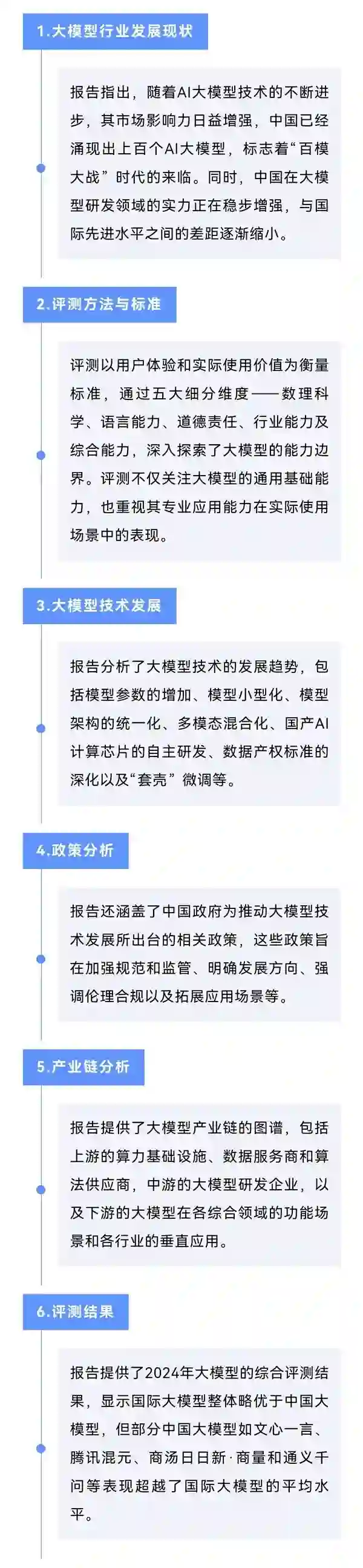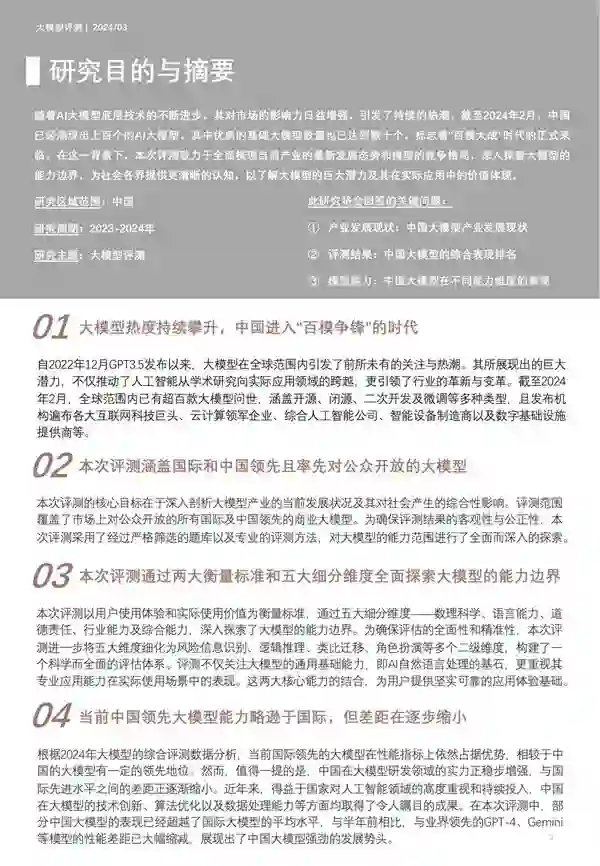 报告选定了中外19个具有代表性的大模型进行评测,其中覆盖15家国内主流模型,与此同时,国际方面选择了OpenAI的GPT3.5和GPT4、谷歌的Gemini1.0以及Anthropic的Claude2,并将这四大模型的平均水平设为国际大模型均线。 报告以五大细分维度——数理科学、语言能力、道德责任、行业能力及综合能力为衡量标准,深入探索了大模型的能力边界,为社会各界提供了对当前中国大模型产业发展现状的清晰认知,以及大模型技术发展的潜力和在实际应用中的价值体现。