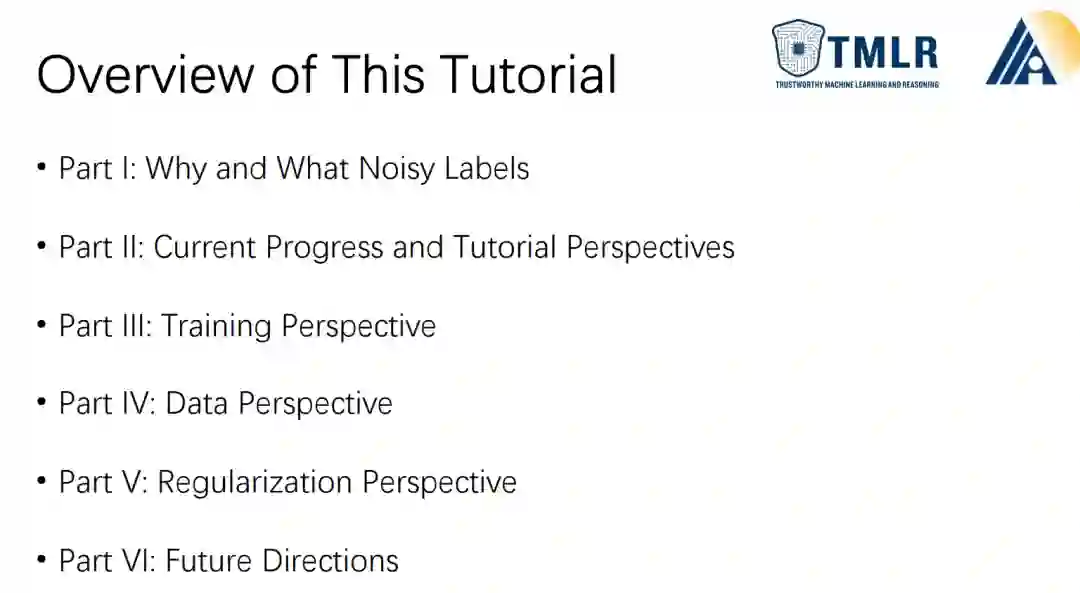概述 噪声数据下的可信学习。有一系列理论和方法被提出来处理噪声数据。据我们所知,标签噪声学习跨越了机器学习的两个重要时代:统计学习(即,浅层学习)和深度学习。在统计学习时代,标签噪声学习侧重于设计耐噪声损失或无偏风险估计器。然而,在深度学习时代,标签噪声学习有更多选项来对抗噪声标签,例如设计有偏风险估计器或利用深度网络的记忆效应。在这个教程中,我们总结了基础知识,并回顾了最新的耐噪声监督技术。通过参加本教程,观众将从统计学习理论、深度学习、典型算法和框架的详细分析以及它们在工业界的实际应用的角度,获得标签噪声学习的广泛知识。