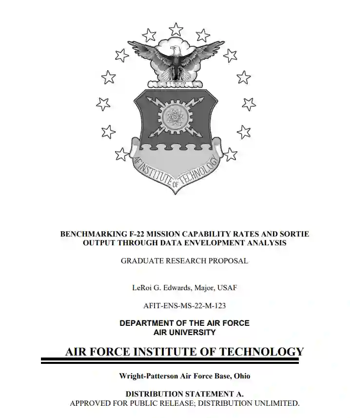 F-22 经过实战验证,在冲突地区作战了十多年。尽管它是地球上最主要的空对空战斗机,但飞机的不断改进继续使 F-22 更具杀伤力。最大化任务能力 (MC) 率的最佳实践没有成功地编纂和保护数据。本文使用数据包络分析 (DEA) 来识别 MC 率优化且高效的基准环境。 DEA 成功地比较了两个单位的投入和产出的相对效率,并确定了效率更高的组织。此外,DEA 还为美国空军现任高级领导人和战术经理提供了对绩效环境的洞察力,在这些环境中,可以最大限度地提高相对效率,以在财政受限的环境中支持国防战略。最后,DEA 模型可用于分析额外的 F-22 单位、其他飞机机队以及基地级维护操作中更细微的输入/输出关系。