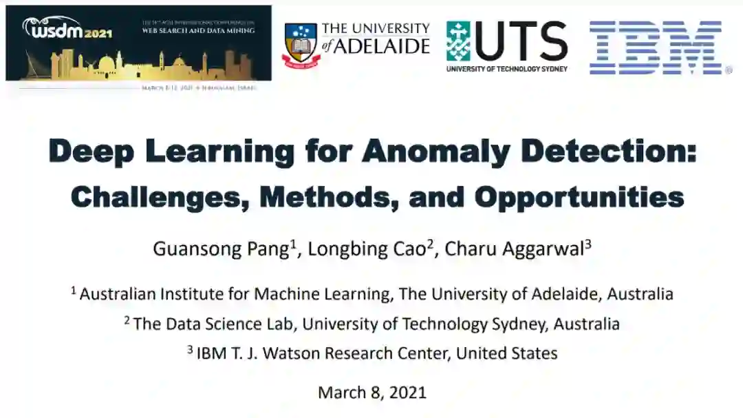 通过本教程,读者将对该领域有一个系统的概述,了解目前最先进的12种不同类型的深度异常检测方法的主要要点、目标函数、基本假设、优缺点,并认识到其在不同领域的广泛适用性。我们还讨论了当前的深度异常检测方法可以从多个不同的角度解决和展望该领域的挑战。