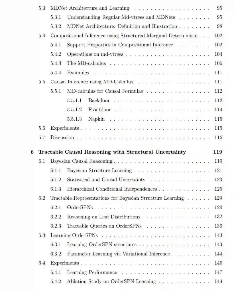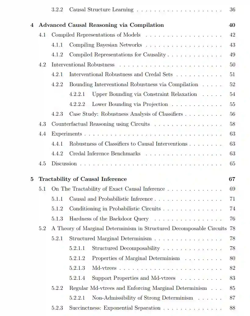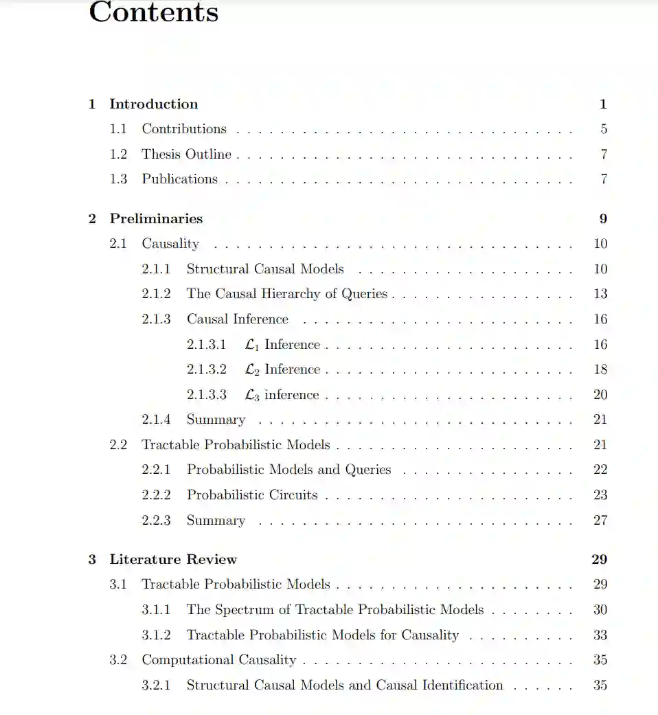 这篇论文探讨了易处理概率建模原理在因果学习与推理中的应用。易处理概率建模是近年来出现的一个有前景的范式,专注于能够进行精确和高效的概率推理的概率模型。特别地,概率电路框架为基于模型结构属性的各种推理查询提供了一个系统性的语言,近期的提案则扩展了表达能力和易处理性的边界。然而,并非所有关于一个系统的信息都能通过观测变量的概率分布来捕获;例如,两个变量之间的因果方向仅凭数据是无法区分的。为了形式化这一点,Pearl的因果层次结构(也称为信息层次结构)划分了三个层次的因果查询,即关联性、干预性和反事实性,这些需要越来越多地了解由结构因果模型和相关因果图表示的底层因果系统。受此启发,我们调查了易处理因果建模的可能性;也就是说,针对因果查询类型进行精确和高效的推理。特别地,我们确定了三种场景,由模型者可用的知识量来区分:即当完整的因果图/模型可用时,当仅观测分布和可识别的因果估计量可用时,以及当对因果图存在额外的不确定性时。在这些场景中,我们提出了能够进行有效和精确因果推理的概率电路表示、结构属性和算法。这些模型与易处理概率模型有所不同,因为它们不仅可以回答不同的概率推理查询,还可以涉及不同的干预和甚至不同的因果图的因果查询。然而,我们也确定了一些关键局限性,这些局限性让人怀疑是否存在一个完全通用的易处理因果模型。我们的贡献还扩展了概率电路的理论,通过提出新的属性和电路架构,从而使得包括但不限于因果推理估计量在内的高级推理查询的分析成为可能。