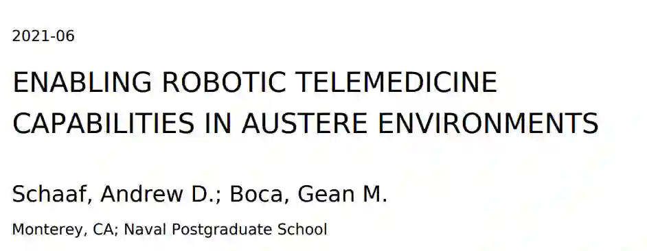 保护作战伤员的生命是美军医疗服务的首要责任。随着作战能力的不断提高,战场上的战斗已经超越了大量的艰苦环境,因此隐含着提高救生医疗能力和确保尽可能高水平医疗保健的需求。静态医疗设施已采用精确遥控机器人形式的远程医疗功能,不仅延长了提供医疗服务的距离,还缩短了提供专业护理的时间。机器人手术是由医疗服务提供者进行的,他们依赖于安全的网络能力,以便在这些敏感的手术过程中提供最佳的连接和响应。支持远程医疗和远程手术的网络能力非常重要,因为它将决定机器人手术的使用地点和方式。本论文将研究 Taurus-M 型远程医疗手术的控制能力,它能够支持实时延迟和精度敏感的远程手术操作,但需要强大的快速响应网络能力。这项研究将有助于开始了解在艰苦环境中预期的网络退化如何限制了执行任务的能力,以及如何在军事医学中发挥增效作用。