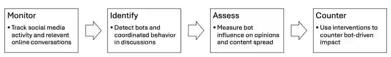 这就是“监测、识别、评估、反制”(MIAC)框架发挥核心作用的地方。它提供了信息作战优化问题的结构化分解,每个阶段要么贡献于关键输入的确定,要么贡献于可操作干预措施的设计。如图1所示,以反制机器人影响这一具体问题为例,这个顺序流程展示了如何将原始观测数据转化为有针对性的影响力活动。