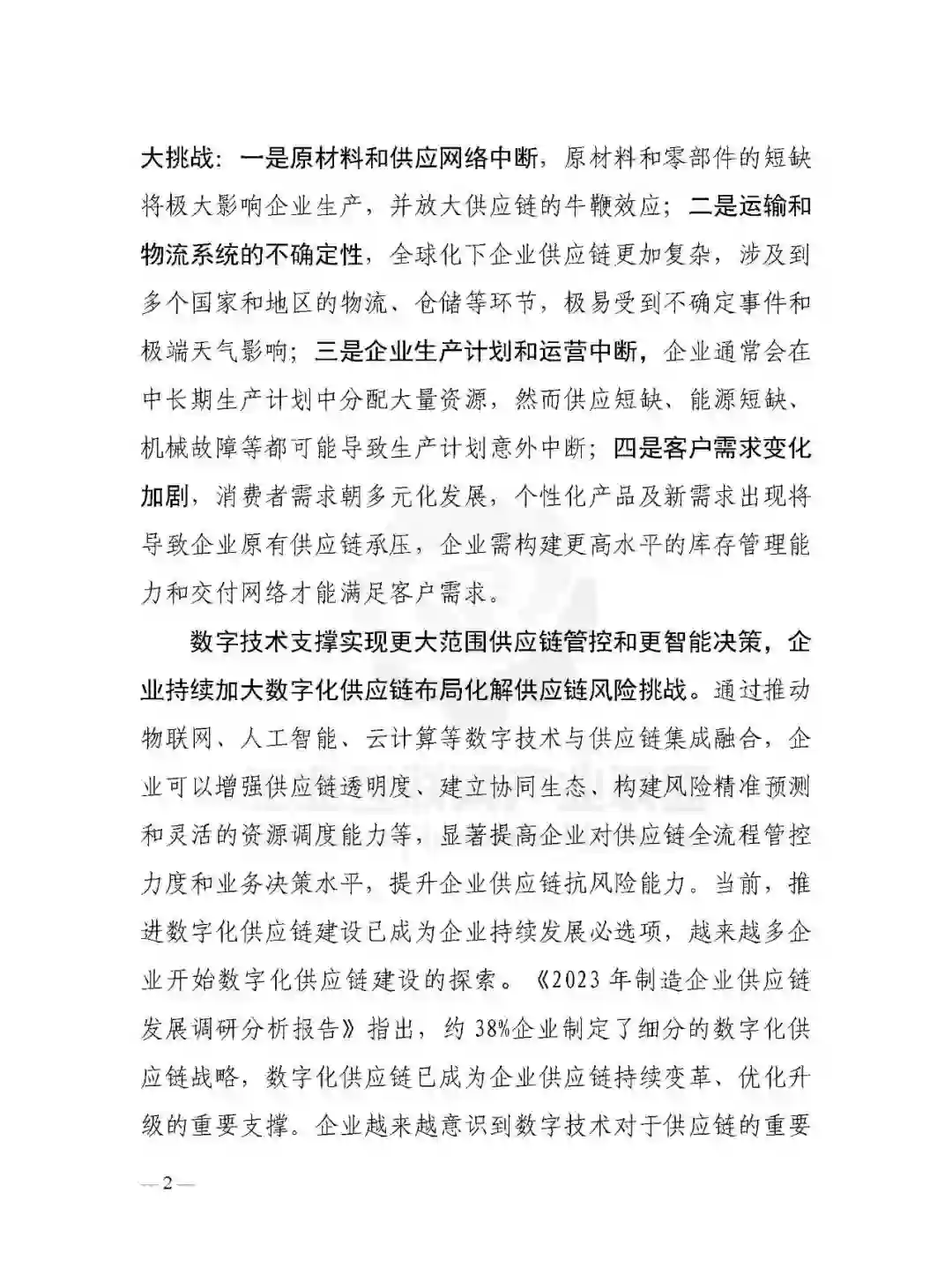 近年来,全球供应链碎片化程度进一步加剧,制造企业频繁遇到材料短缺、生产中断、物流延误等问题,扰乱了企业正常生产秩序。当下,高效稳定的供应链体系对企业愈发重要,能使企业更有效配置产业资源,保持领先地位,培育国际经济竞争新优势。伴随着全球企业数字化转型深入推进,数字技术与供应链融合不断深化,展现出了巨大赋能作用,数字化供应链成为产业界应对供应链风险挑战的重要探索方向。在越来越多企业的实践下,物联网、大数据、人工智能等技术与供应链融合进程加快,驱动供应链形态由线性走向网状,加速生产组织新模式形成,更多创新的商业模式涌现,不断推动企业业务增长。数字化供应链正成为企业提升供应链运营能力和竞争力的必选项,也成为世界主要经济体重要布局方向。为加速推动数字化供应链发展,工业互联网产业联盟重点研究分析了数字化供应链的应用和产业发展情况,希望一定程度上对未来发展方向有所预见,为制造企业、服务商等利益相关方提供有益参考。本报告由五部分组成,第一部分介绍了数字化供应链发展背景、脉络和内涵。第二部分梳理了主要国家战略布局情况。第三部分着眼产业界应用探索,围绕企业层和产业层总结了数字化供应链应用体系,并分析了应用发展趋势。第四部分剖析了支撑产业主体布局及变革方向,对三类核心主体的布局方向、竞合关系进行了介绍和分析,并总结由此驱动的产业生态演进情况。第五部分对我国数字化供应链发展意义、发展情况和发展建议进行了探讨。牵头编写单位:中国信息通信研究院