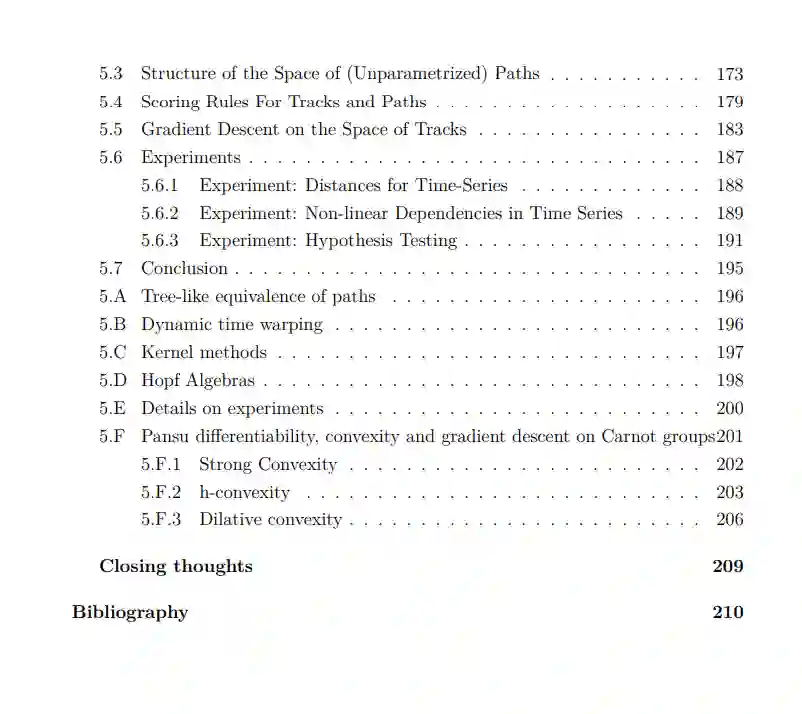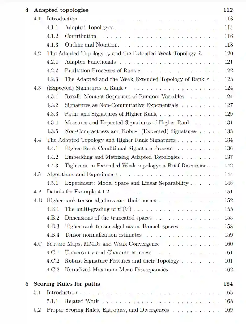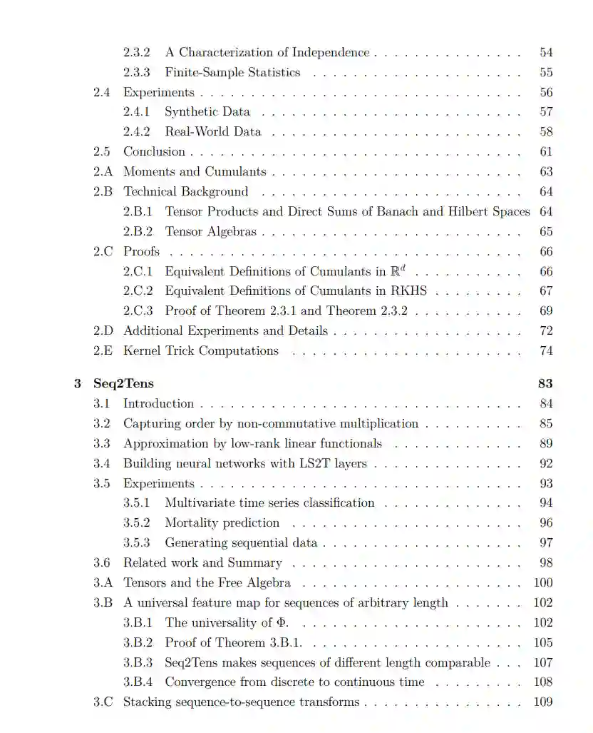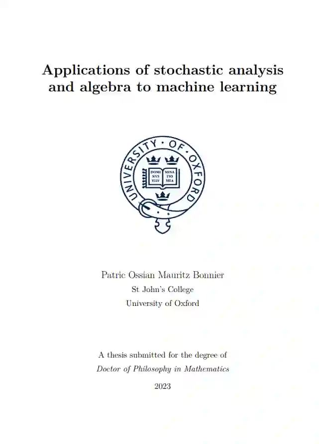 在本论文中,我们考虑了从随机分析和代数到统计和机器学习的工具的应用。其中大多数工具是已知为签名方法的不同形式。在过去的70年里,签名在数学的几个不同领域被发现和重新发现。简而言之,它将一个在向量空间中演变的路径映射到包裹同一空间的一个群体。它对统计如此有用的原因有两个:一是它的不变性集在许多应用中都非常受欢迎;二是其图像群体结构严密,非常适合使用代数工具进行数学研究。这里的主要目标是研究如何使用签名来表示给定路径的统计属性,以及如何将这些属性应用于机器学习。这个目标表现为 - 除其他事项外: • 一种用于签名的新型累积量,具有独特的组合属性,可用于表征路径的独立性, • 在再生核希尔伯特空间上的累积量,与签名累积量有关,尽管没有明确使用签名, • 将签名推广到其他类型的特征映射到非交换代数, • 具有初始拓扑的特征映射,捕捉随机过程滤波的属性, • 以及一系列得分规则与相关的散度、熵和路径的相互信息,这些都尊重它们的群体结构。 这些被划分为单独的、自成体系的章节,可以互相独立阅读。