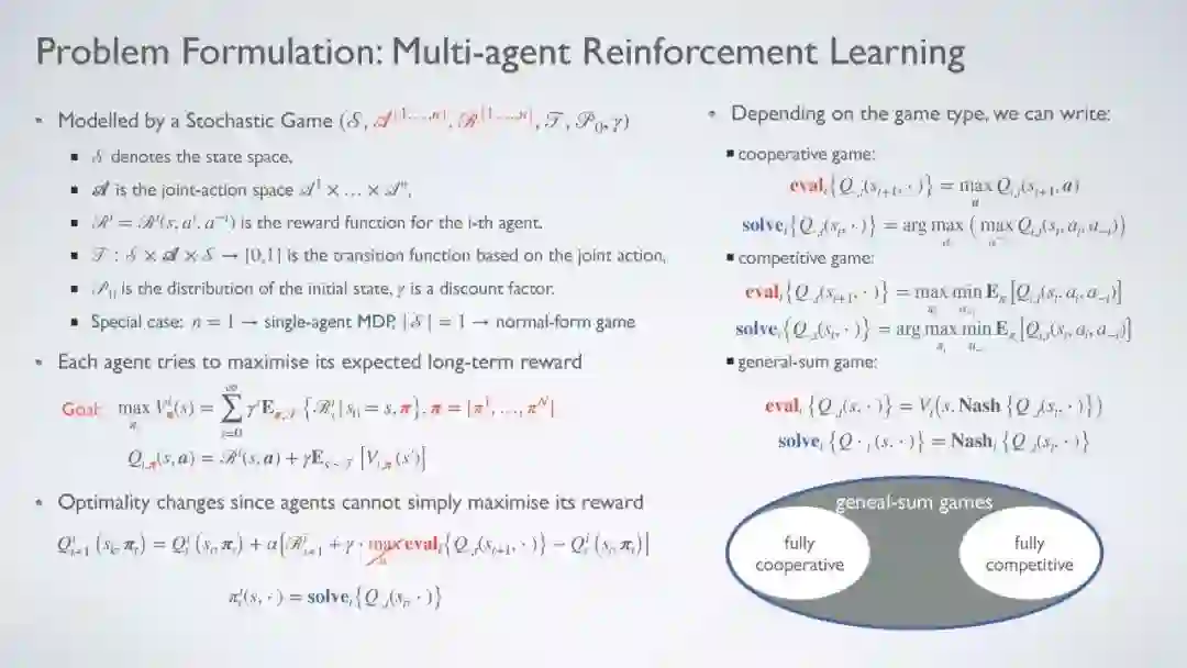 MARL最后一个值得一提的成就是它在扑克游戏《Texas hold ' em》中的应用,这是一种多玩家广泛形式的游戏,玩家可以获得不完整的信息。Heads-up(即两个玩家)无限持有的游戏中有超过6 × 10161种信息状态。直到最近,游戏中才出现了突破性的成就,这多亏了MARL。两个独立的程序,DeepStack (Moravčík等人,2017)和Libratus (Brown & Sandholm, 2018),能够击败专业的人类玩家。最近,Libratus被升级为Pluribus (Brown & Sandholm, 2019年),并表现出非凡的表现,在无限制设置中赢得了5名精英人类专业人士的100多万美元。为了更深入地理解RL和MARL,需要对概念进行数学表示法和解构。在下一节中,我们将提供这些概念的数学公式,从单代理RL开始,逐步发展到多代理RL方法。