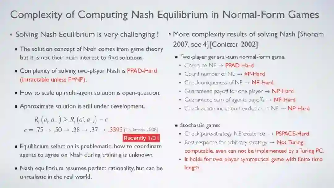 与单agent RL相比,多agent RL是一个更适合现实世界AI应用的通用框架。然而,由于多个agent同时学习的存在,除了单agent RL中已经存在的方法外,MARL方法提出了更多的理论挑战。与通常有两个代理的经典MARL设置相比,解决多代理RL问题更具挑战性。事实上,1 组合复杂性,2 多维学习目标和3 非平稳性问题都导致大多数MARL算法能够解决只有4个参与者的博弈,特别是两方零和博弈。