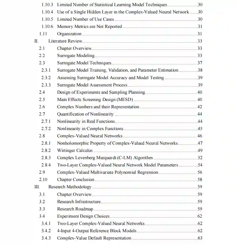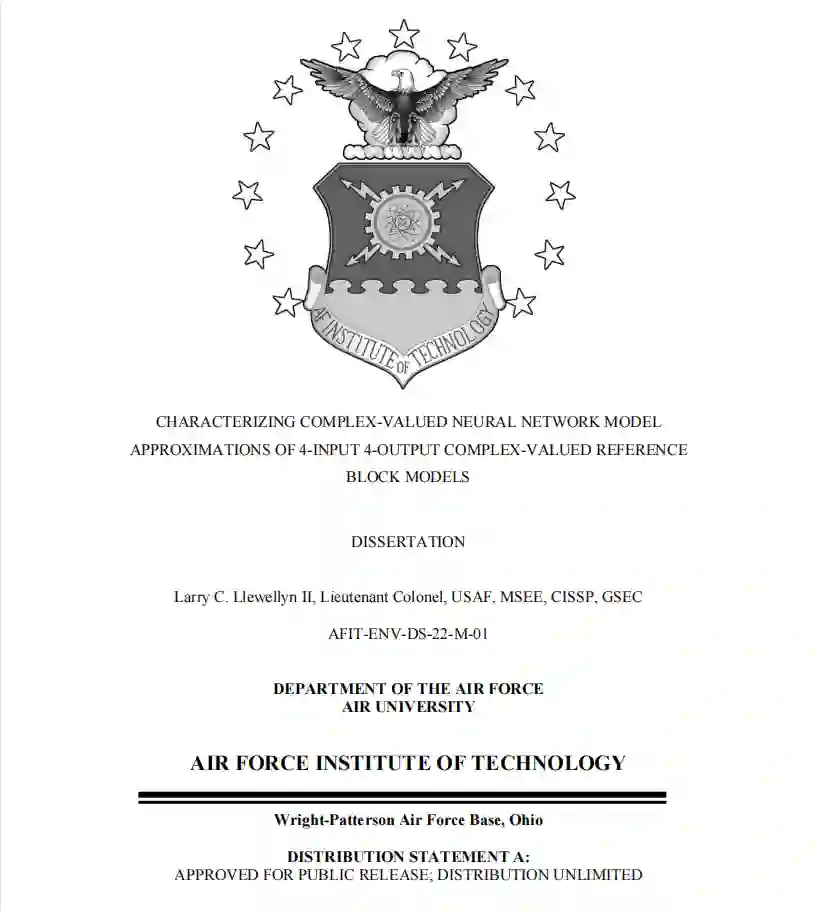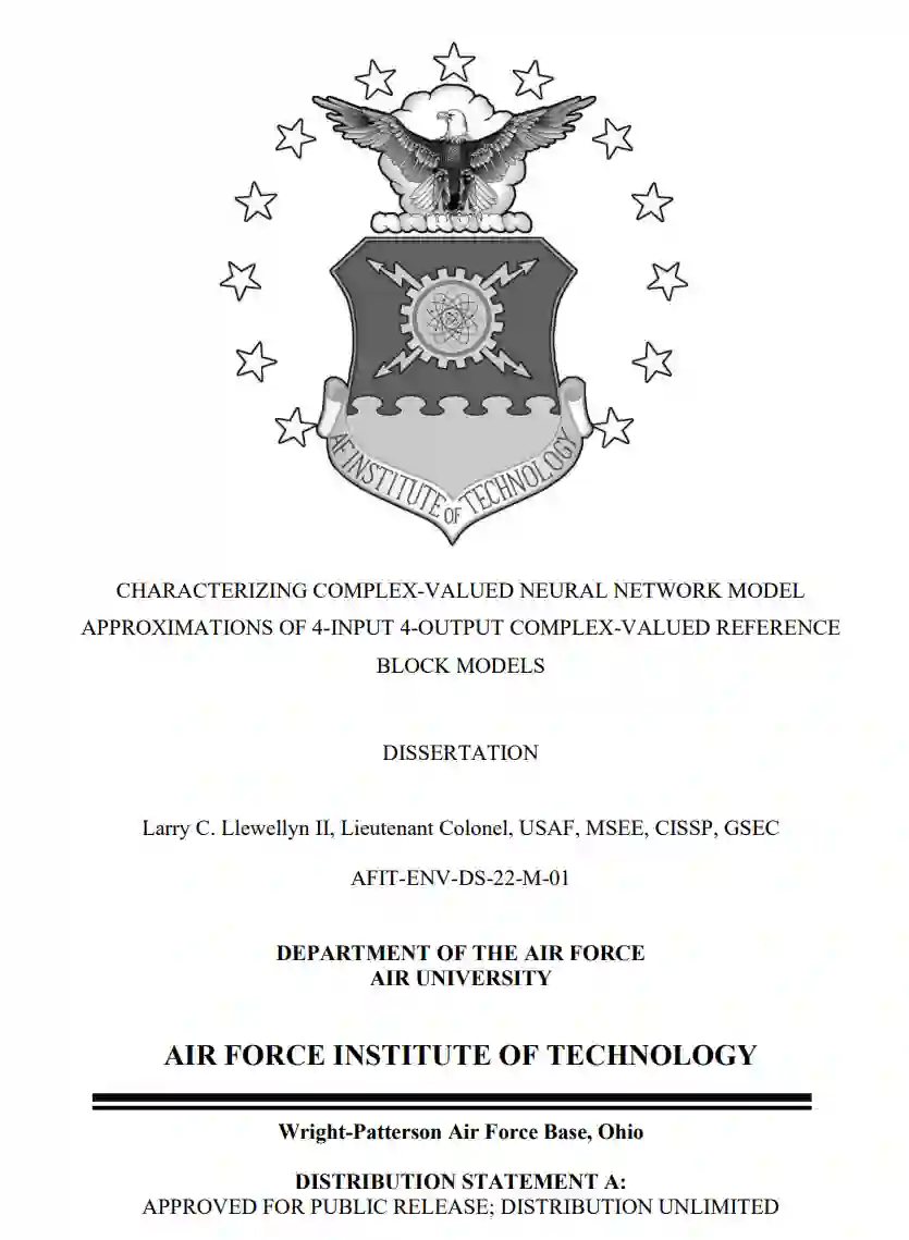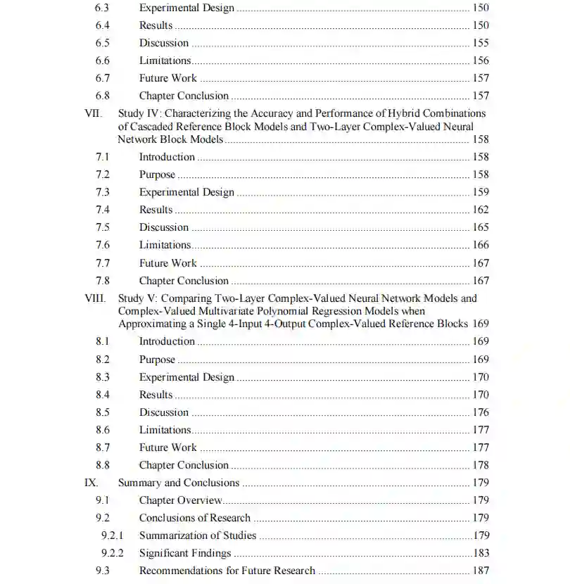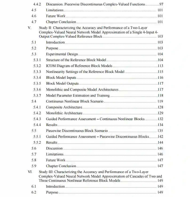 本论文中提出的研究是新颖的,因为它使用神经网络进行连续函数逼近,而不是数据分类;它使用的神经网络是为处理复数而设计的;它使用单一的单片两层复值神经网络来逼近四个独立的输出,而不是为每个输出使用单独的神经网络。进行了一些实验研究,以(1)确定对参考块模型近似的准确性、性能和误差有显著影响的复值神经网络超参数;(2)将单一参考块模型的复值神经网络近似作为块的非线性的函数。(3)描述复值神经网络对两个和三个参考块模型的级联近似的特征;(4)描述复值神经网络对三个级联参考块模型和近似块模型的混合组合的特征;(5)比较和对比在近似单一参考块模型时使用复值神经网络模型和多元多项式回归模型。