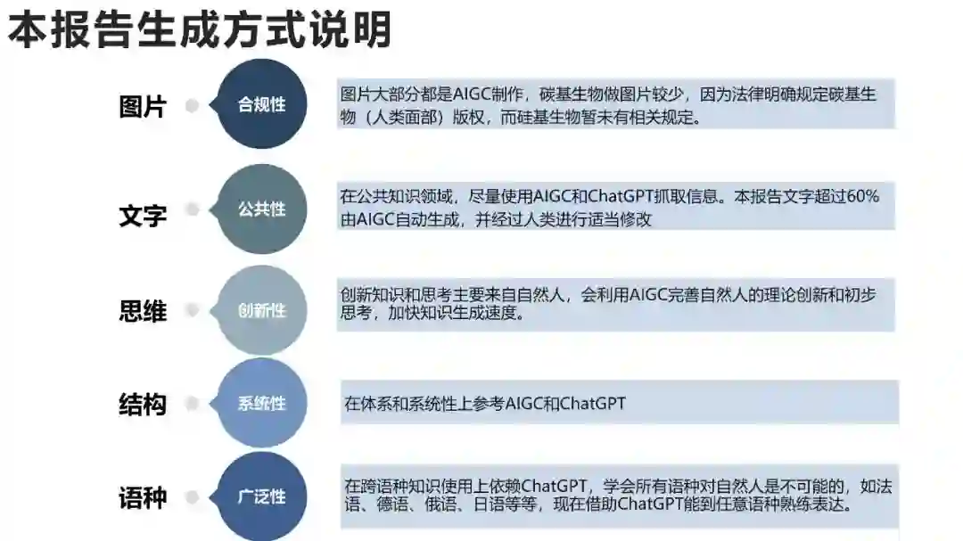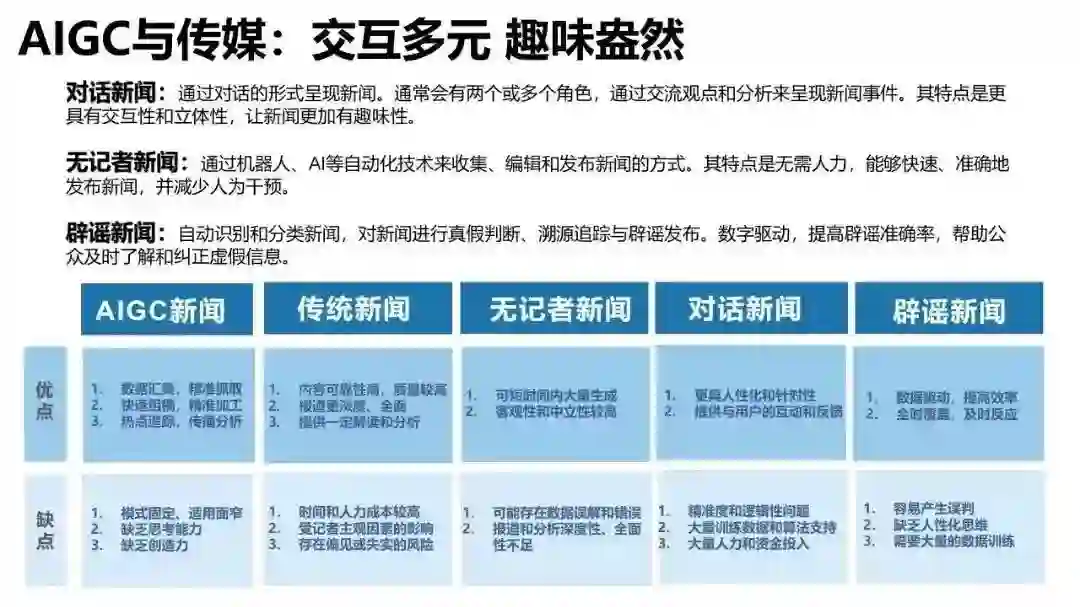 《报告》还提出,未来,通过AIGC与传媒交互,可能出现更多元的新闻方式: 1. 对话新闻:通过对话的形式呈现新闻。通常会有两个或多个角色,通过交流观点和分析来呈现新闻事件,其特点是更具有交互性和立体性,让新闻更加有趣味性。 1. 无记者新闻:通过机器人、AI等自动化技术来收集、编辑和发布新闻的方式。其特点是无需人力,能够快速、准确地发布新闻,并减少人为干预。 1. 辟谣新闻:自动识别和分类新闻,对新闻进行真假判断、溯源追踪与辟谣发布。数字驱动,提高辟谣准确率,帮助公众及时了解和纠正虚假信息。