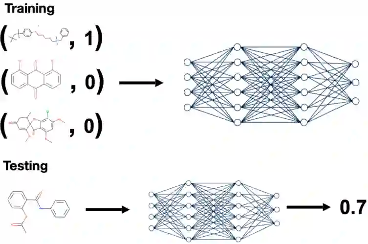 神经网络模型的关键在于如何在机器学习算法中以较合理的方式表示分子。早期的模型使用专家构建的特征(如指纹与描述符)来表示分子。机器学习算法的作用是学习如何权衡这些特征,以提供准确的性质预测。这类模型的预测准确性很大程度上取决于所选特征的质量。而神经网络直接从数据中自行学习合适的特征表示。输入分子集与性质数据集进行网络的训练后,向网络输入新分子,我们可以得到该分子的性质预测值(如图1)。