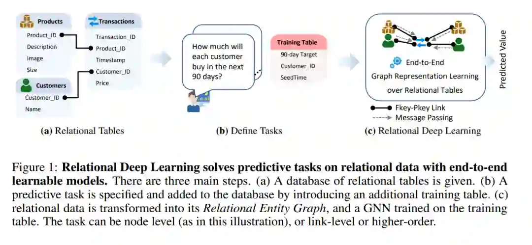 我们在这里介绍关系深度学习,这是一种满足关系表端到端深度学习范式需求的蓝图(见图1)。通过端到端的表示学习,我们充分利用了关系表中可用的丰富预测信号。我们方法的核心是将关系表表示为一个异质的关系实体图,其中每一行定义一个节点,列定义节点特征,主外键关系定义边缘。然后可以应用图神经网络(GNNs)来构建端到端的预测模型。