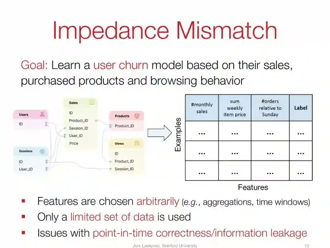 换句话说,关系数据上的预测任务是通过手工制作的特征和学习型模型的组合来解决的。特征工程存在几个问题:(1) 它是一个手动的、缓慢的、劳动密集型的过程;(2) 特征选择很可能是高度次优的;(3) 只有一小部分可能的特征空间可以手动探索;(4) 通过将数据强制放入单个表中,信息被聚合到低粒度特征中,从而失去了宝贵的细粒度信号;(5) 每当数据分布发生变化或漂移时,当前特征变得过时,新特征必须手动重新发明。