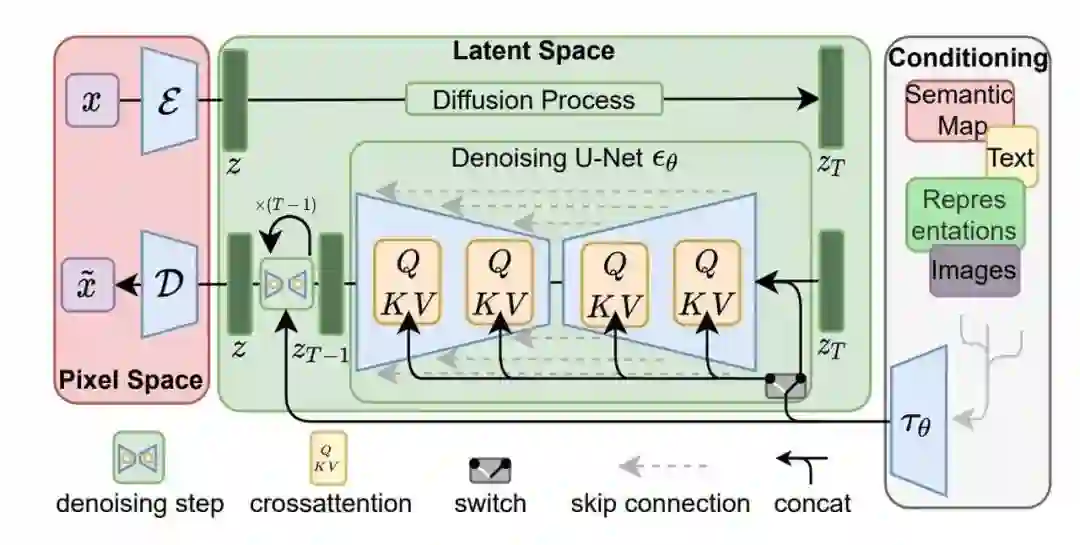扩散模型原理。 * 使用UNet模型的图像评分函数 * 基于上下文词嵌入的提示语理解 * 让文字通过交叉注意力影响图像 * 通过添加一个自动编码器来提高效率 * 大规模训练。